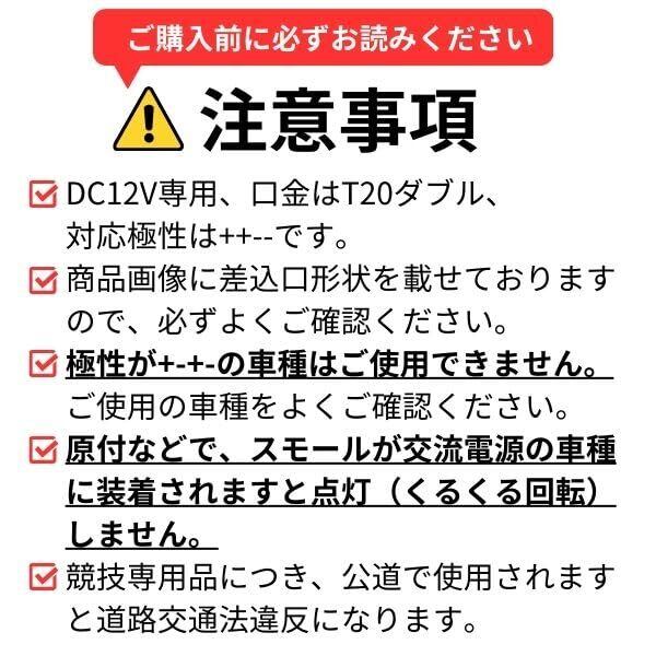 LEDカラー:レッド 口金:T20ダブル 対応極性:++- -数量:1個入り※原付などで、スモールが交流電源の車種に装着されますと点灯(くるくる回転)しません。 確認方法は、エンジンをかけずにキーONの状態で、ブレーキレバーを握ればストップライトは点灯するのに、テールランプはエンジンをかけるまで点灯しない車種は適合不可です。 商品装着後の返品はお受付出来ませんので良くご確認ください。