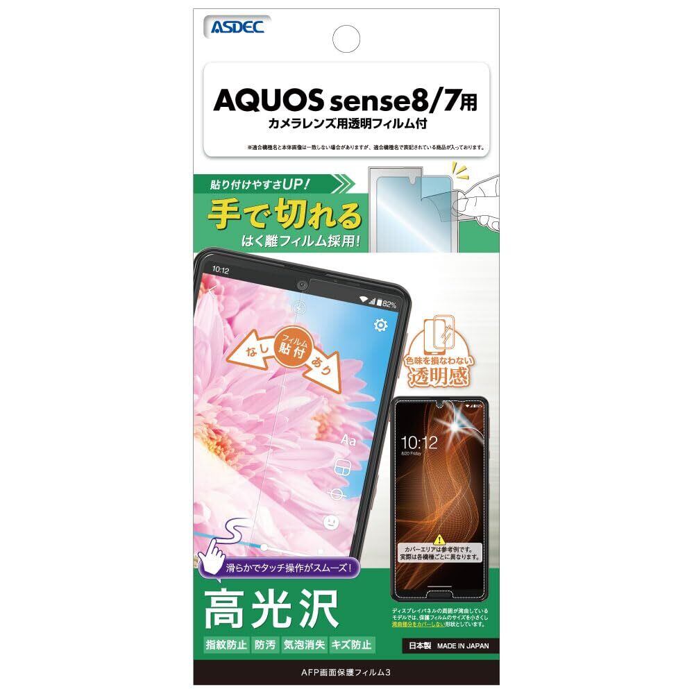 ASDEC AQUOS sense8 / sense7 「手で切れるはく離フィルム」 フィルム カメラフィルム 光沢 クリア 日本製 指紋防止 防汚 気泡消失 ASH-SH54D-Z/アクオスセンスエイト SH-54D SHG11 SH-M26 保護フィルム AFP 画面保護フィルム