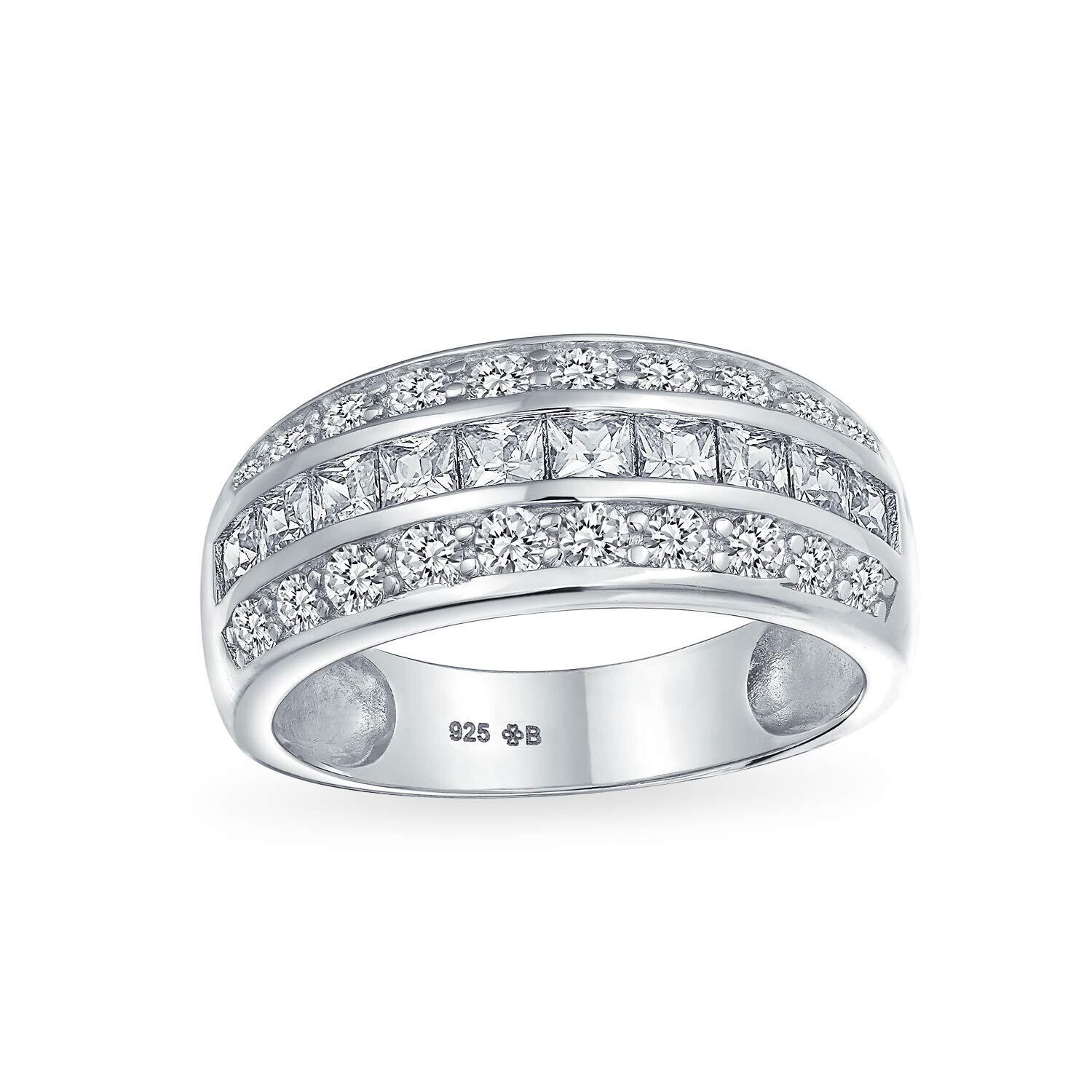 アールデコAAAキュービックジルコニア半永久チャネルは女性.925スターリングシルバーコンフォートフィット8MMのためのプリンセスカットCZドーム3行の広いステートメントウェディングバンドリングを設定しました。