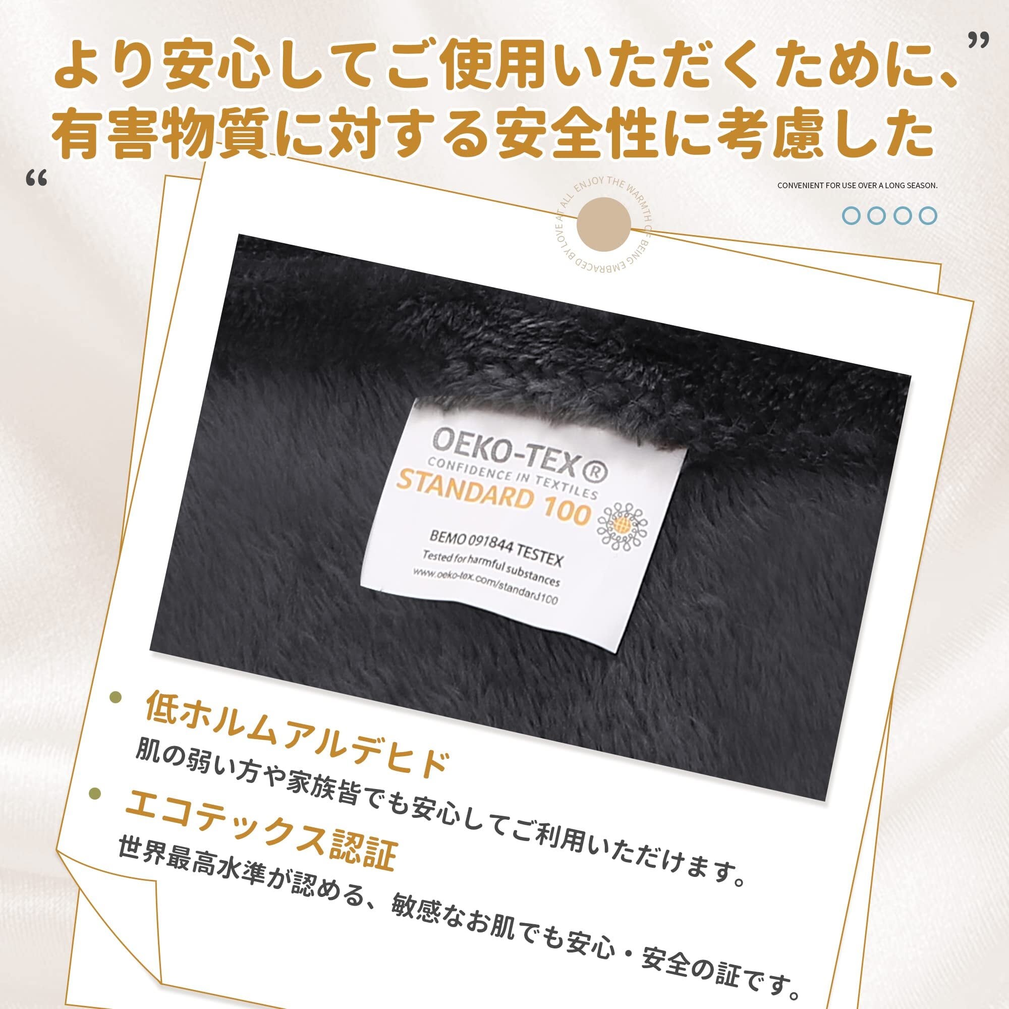 【エコテックス認証済み】世界水準が認める、肌の弱い方でも楽々使える認証を取得、お子様や家族皆でもご利用いただけます。