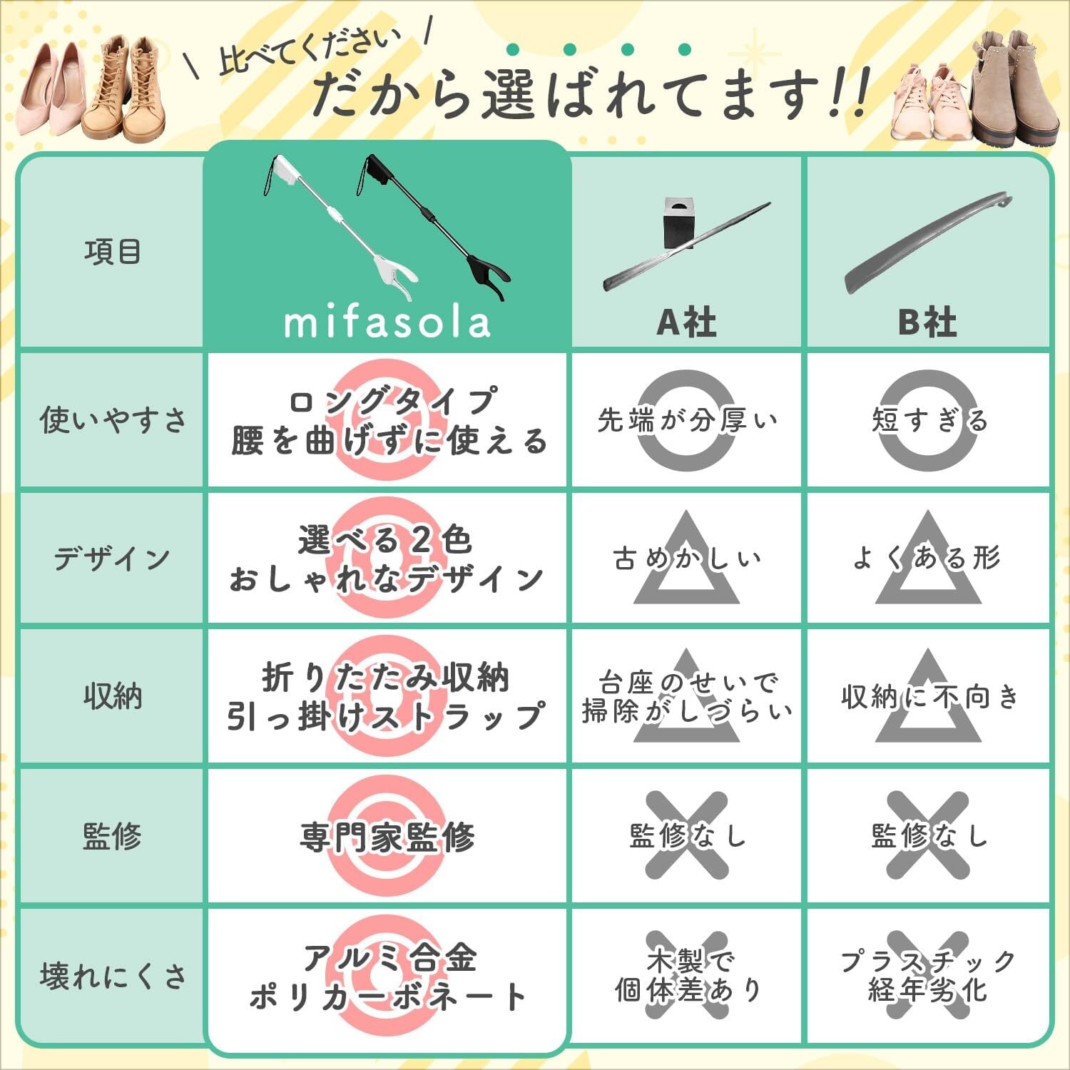 【斜め上を行くアイディア】どうして私たちが、こんな少し変わった靴べらをお届けするのか?それは実際に使ってみて、昔ながらの木製靴べらやプラスチック製品よりも、想像以上に便利で、今までの一般的な靴べらよりも壊れにくいことに気づいてしまったからです。お客様がご自宅で「これ便利!」と笑顔になる瞬間が、私たちの目指すゴールです。