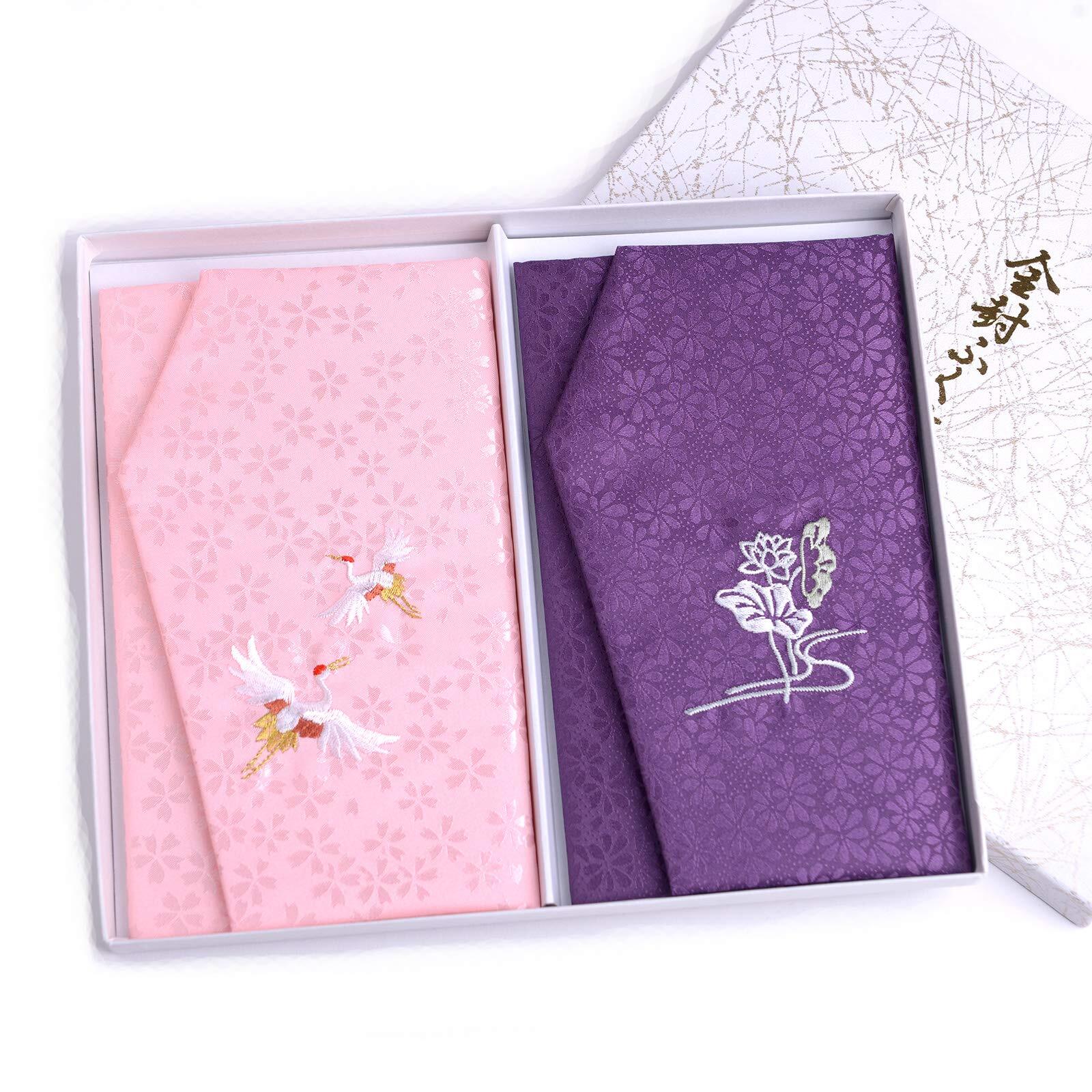 美しい綸子(りんす)の生地に、 鶴(お祝い)・蓮(お悔やみ)の刺繍を施した慶弔ふくさ2枚セットです。 色合いも優しく、セットでお買い得な商品です。