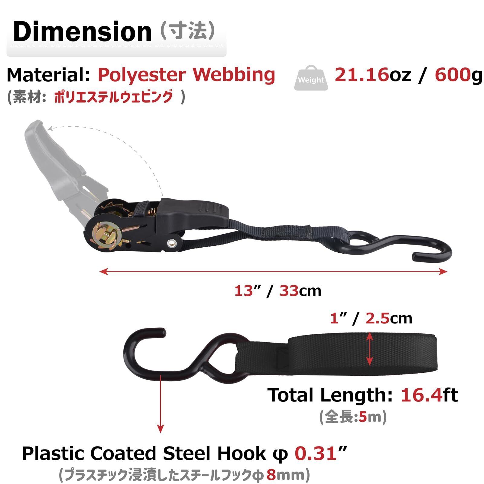 【寸法】荷締めベルト幅:25mm;長さ:調整側約5m、固定側約0.33m;フック直径:8mm、重量600g。ラチェット式で使い便利です