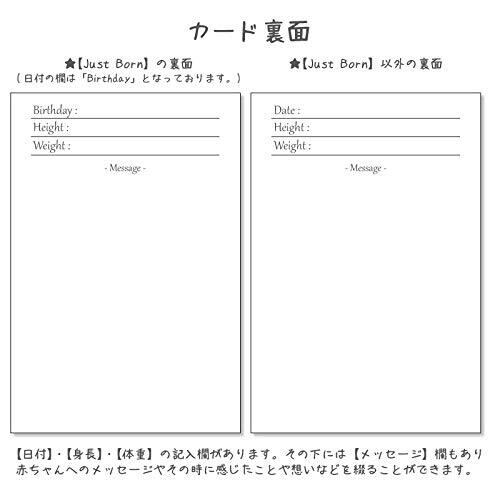 マンスリーカードとは、誕生したその日から1歳(~3歳)のお誕生日までの赤ちゃんの成長記録を写真に残すための月齢カードです。 裏面には赤ちゃんへのメッセージを書き込んだり、その時の様子や身長、体重などを記録しておくこともできます。 赤ちゃんの成長はあっという間です!たくさん思い出を残していきましょう 撮った写真や書き込んだカードはアルバムや額縁などに入れたり、カードを付属の封筒に保管しておいて将来お子様にプレゼントするのもオススメです。