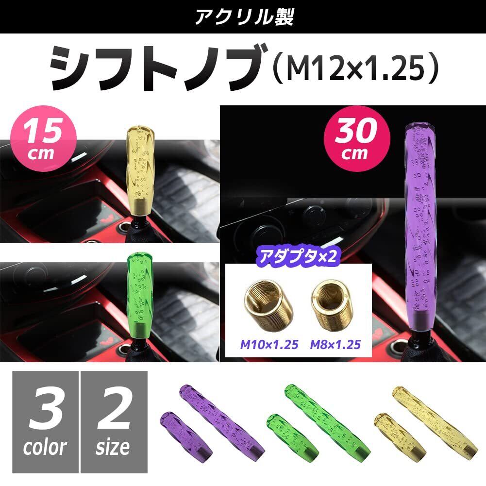 【カラー】パープル、グリーン、イエロー【サイズ】15cm、30cm【素材】アクリル【セット内容】シフトノブ(M12×1.25)、アダプタ×2(M10×1.25、M8×1.25)