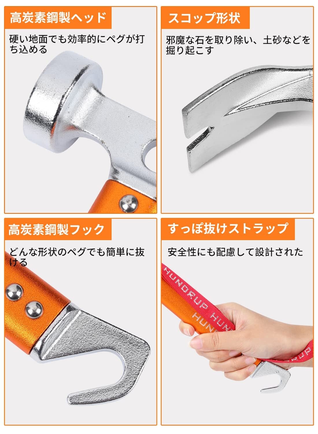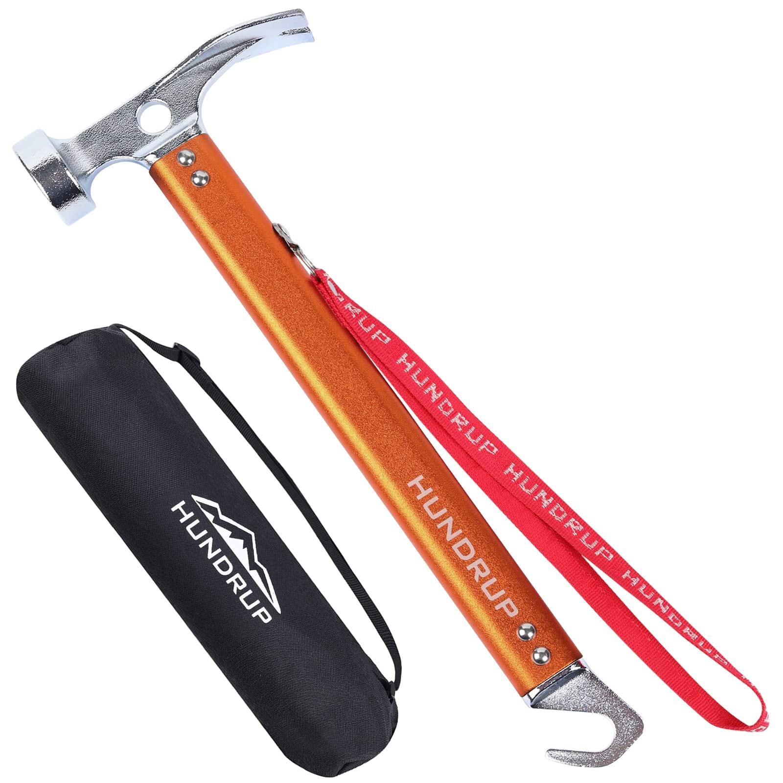 HUNDRUP ペグハンマー 軽量 キャンプハンマー 3in1多機能 (抜く/打つ/掘る) 高炭素鋼製 固定用リベット追加 アルミ製ハンドル テントハンマー 収納袋付き ソローキャンプ 設営用具 日常作業 アウトドア 登山