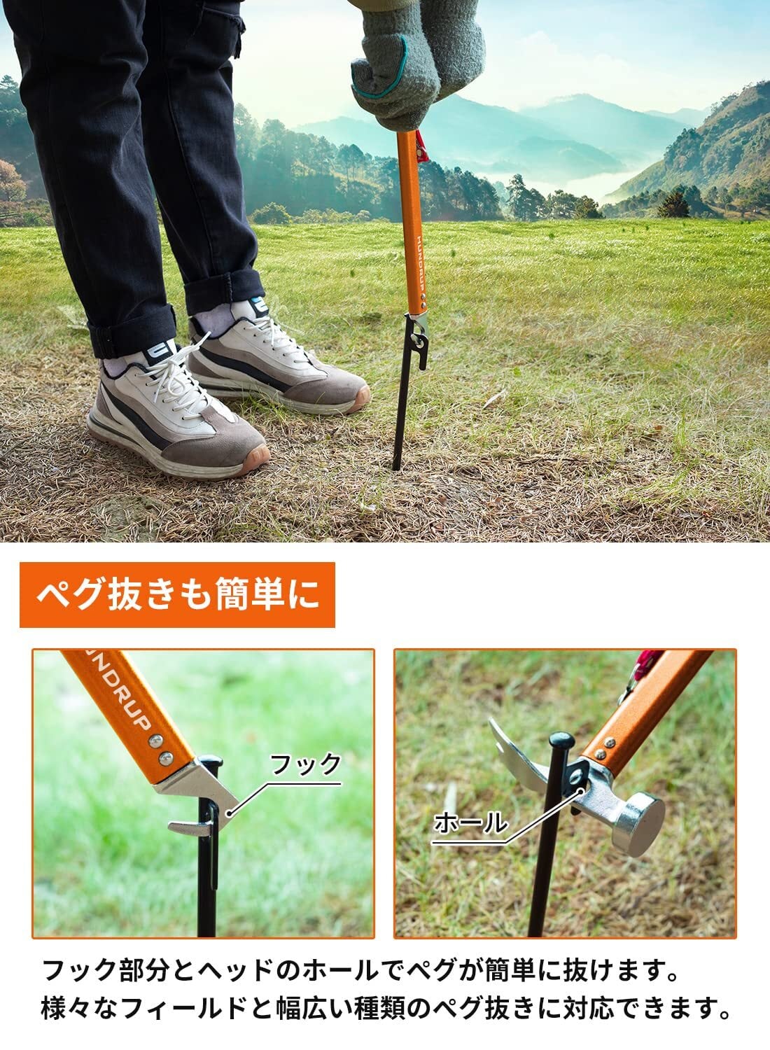 【3つの機能を備えたハンマー】:デザイン性と機能性を兼ね備えました。ペグの打ち込み、ペグの引き抜き、穴掘りがすべてこの一本でできます!①テントハンマーの頭部は重量感のある高炭素鋼で、固い地面でもぺぐを固定できます。②ヘッド片側はスコップとして使え、邪魔な石を取り除いたり、土壌や砂などを掘り起こったりすることができます。③ペグハンマーの後部に設けられたフックとホールを使ってあらゆるタイプのペグを抜くことができます。