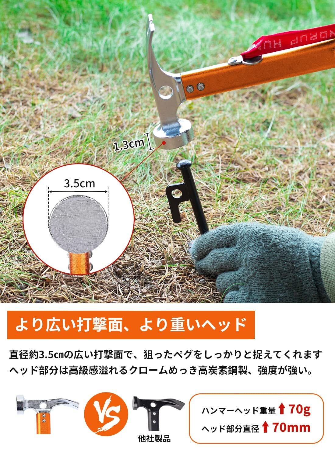 【細部と品質にこだわり】:ヘッドは打撃部分がペグにヒットさせやすい大きさで、直径約3.5㎝の広い打撃面で、市販の直径2.8cmのハンマーと比べて、狙ったペグをしっかりと捉えてくれます。 ヘッドの重量を70g重くすることで、硬い地面でもペグをぐいぐい打ち込めます。