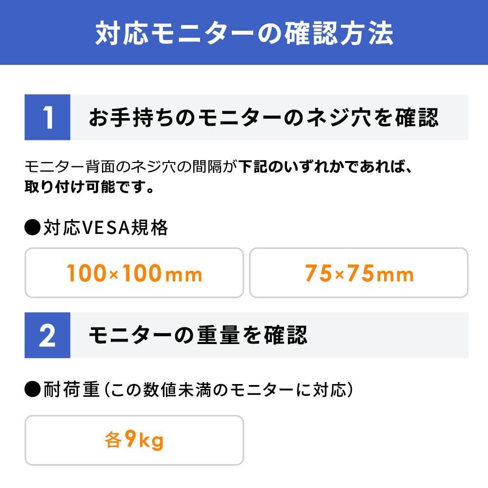 モニターの耐荷重:9kg(1アームにつき) 対応VESA:75×75、100×100(mm) 対応モニターサイズ:最大各32インチ