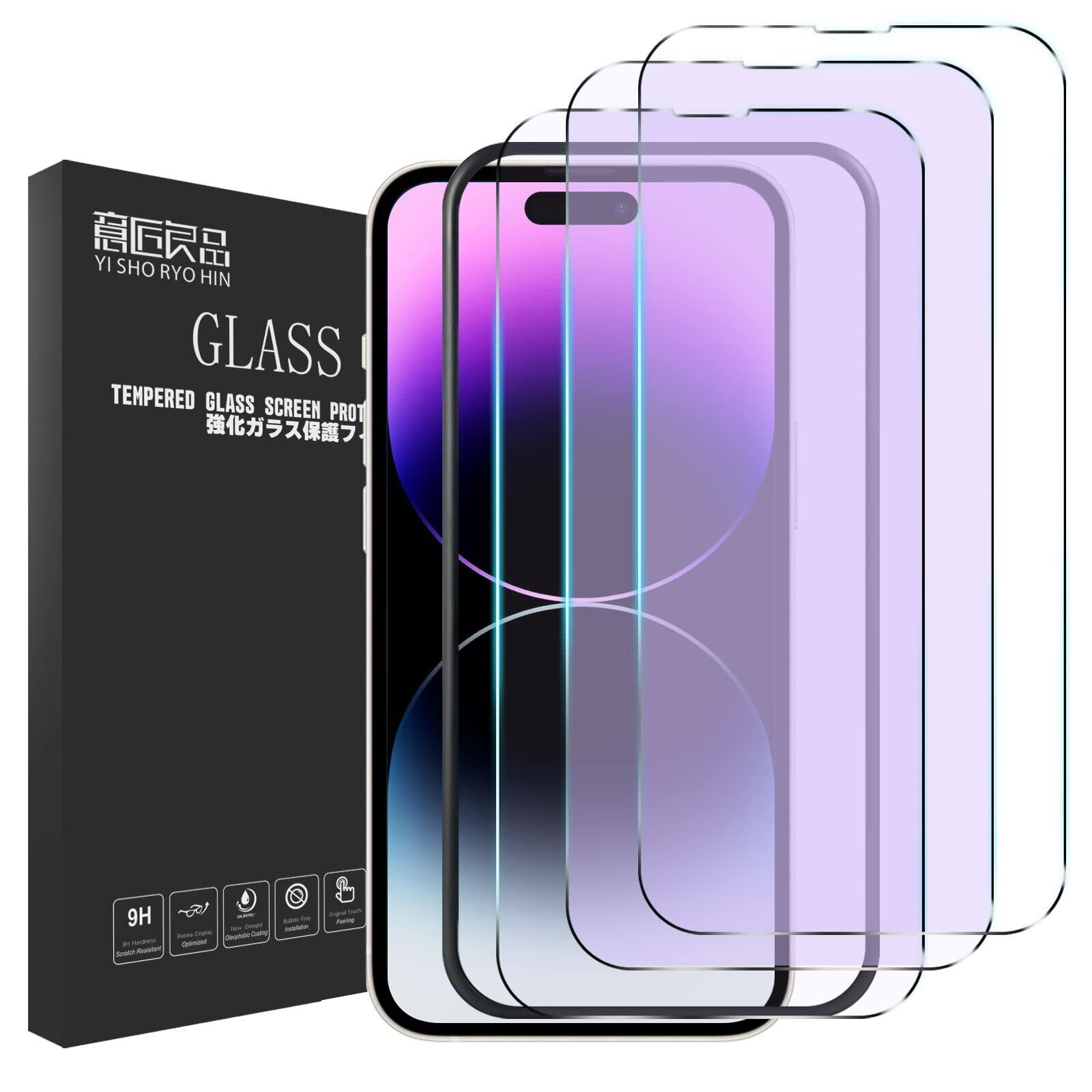【目に優しい! 3枚入り】iPhone14proMaxガラスフィルム ブルーライトカット 6.7インチ 国産AGCガラス使用 極薄 気泡なし 硬度9H 液晶保護フィルム ラウンドエッジ ゴリラガラス アイフォン14proMax 強化ガラス 意匠良品 (14proMax, 3枚ブルーライトカット ガイド枠付き)