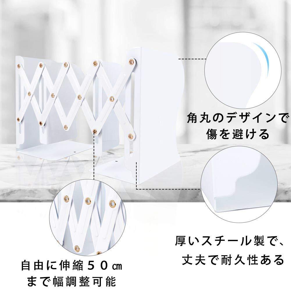 ブックエンド 伸縮 本立て 金属製 ブックスタンド 倒れない スライド式 収納 デスク整理 卓上本棚 卓上 本立て おしゃれ 仕切りスタンド (ホワイト)