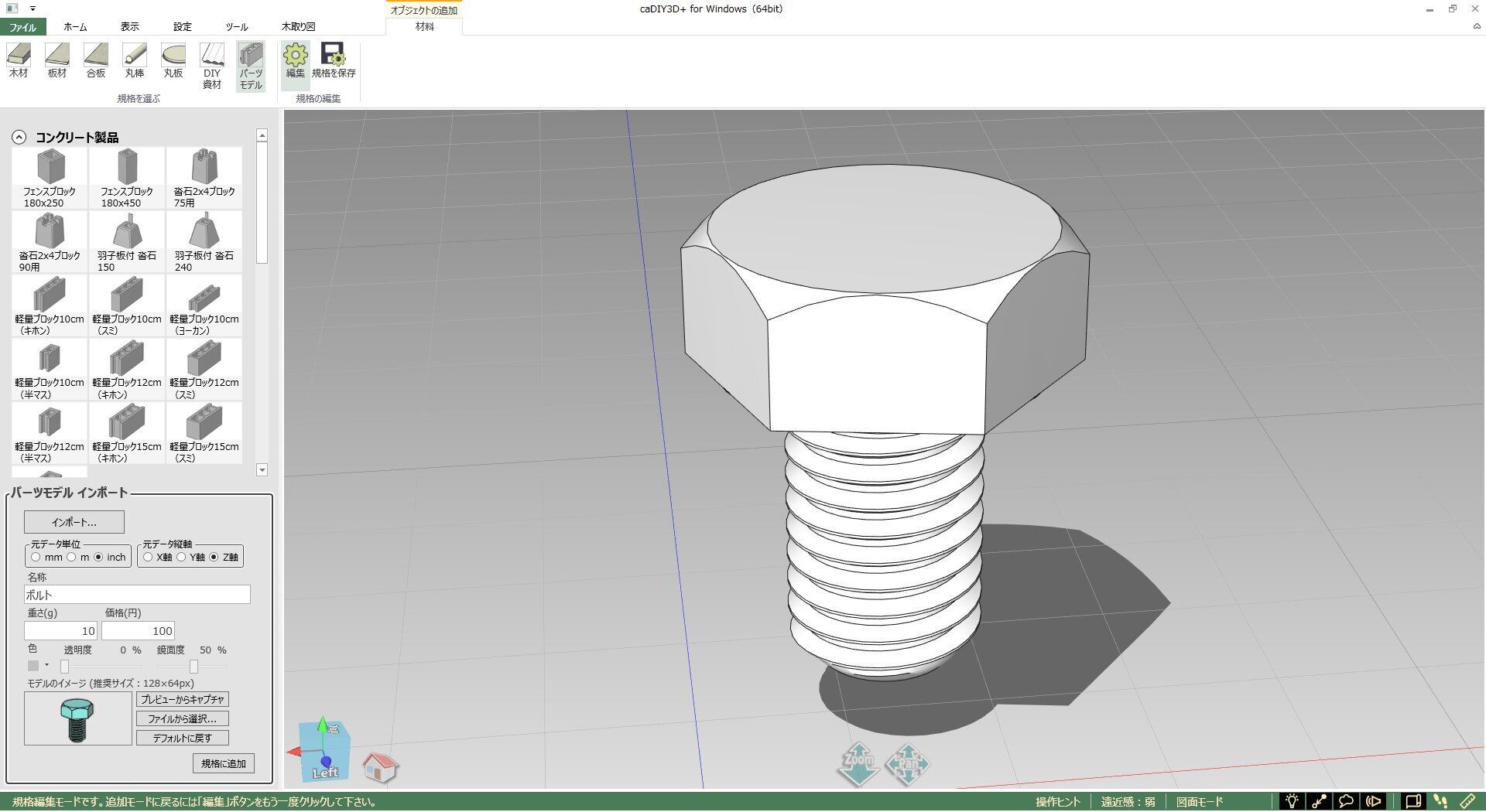 caDIY3D+ の特徴は、ホームセンターやDIYショップで販売されている木材やDIY資材の寸法規格、重さ、価格を3Dモデルパーツとして登録しているので、実際の材料を基準にして設計を 行うことです。出来上がりのイメージをリアルに確認することが出来ます。他にも DIY 向けの特徴的な機能として、