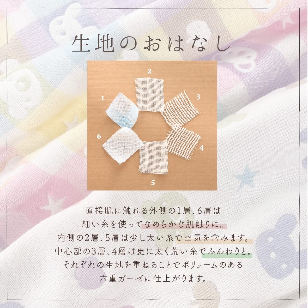 【6重ガーゼ】6重に重ねたガーゼ生地が空気をたくさん含むので、冬はふんわり暖かく、夏のクーラー対策にもおすすめです。