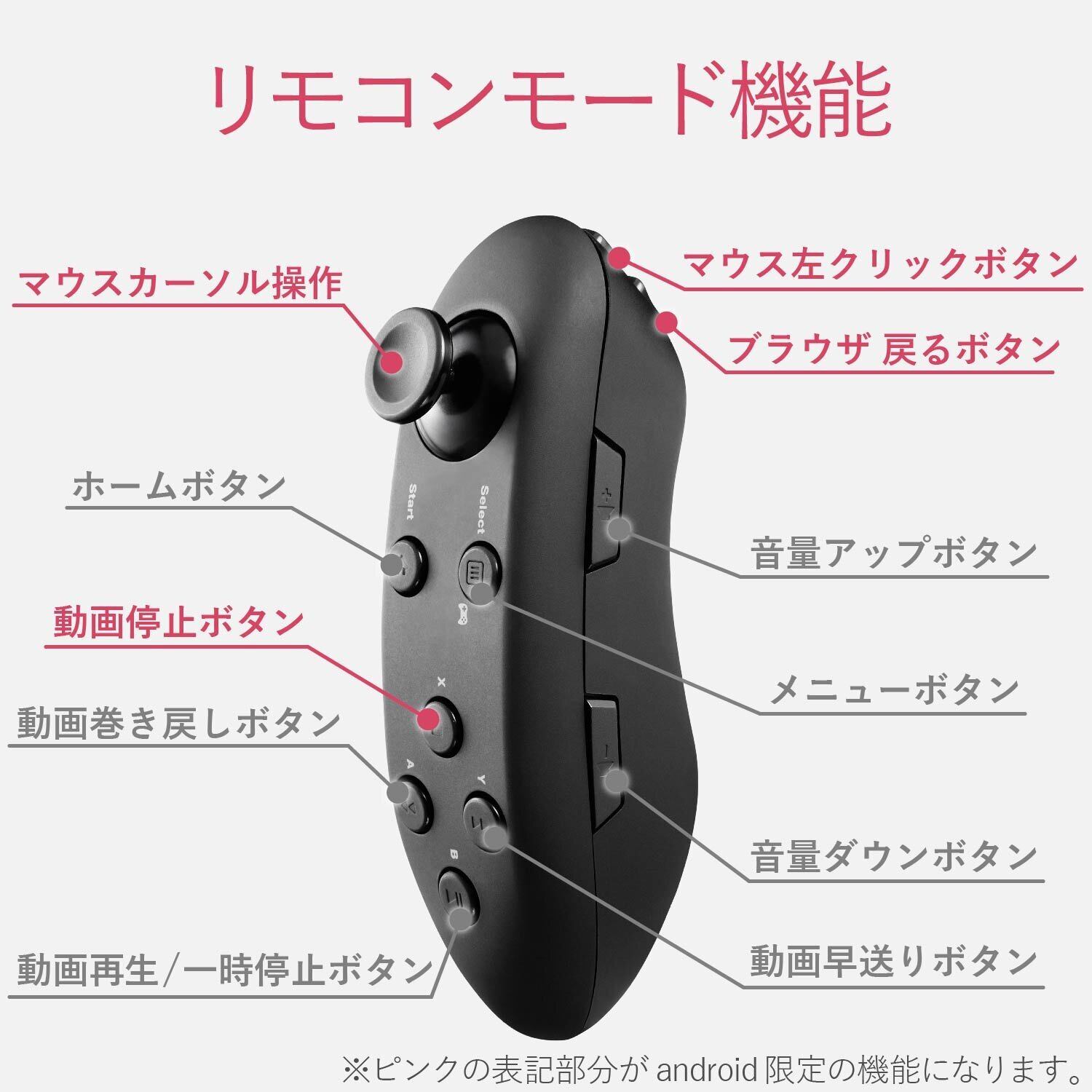 VR動画の再生/一時停止、早送り/巻き戻し、音量調整などがワイヤレスでコントロールできます。※iOS 端末では、マウス左クリック/ページ戻る/マウスカーソル操作/メニュー/停止は使用できません。