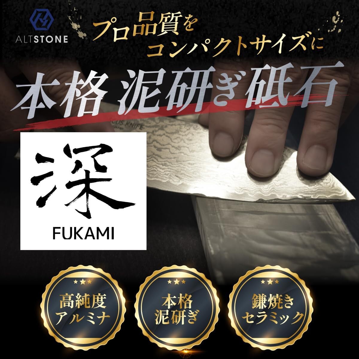 ALTSTONE 砥石 「深 FUKAMI」 【滑かな研ぎ味】 中砥石 1000番 コンパクトサイズ セラミック砥石 [ 名倉砥石 滑り止めマット付き ] 包丁用 日本製 (中砥 #1000)