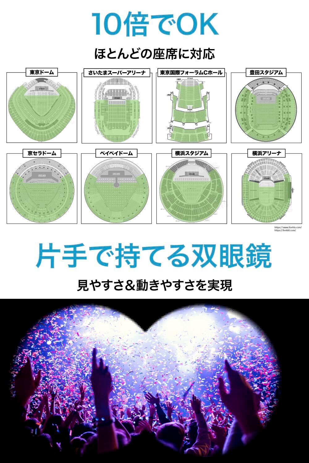 【推し活に最適な10倍! 】\せっかく行くなら大きく見ようよ!/ライブに最適な10倍双眼鏡。アリーナ後方〜スタンド席からでも推しの顔がクリアに見える!動きのある対象もはっきりとらえるから、ライブでどの瞬間の推しも見逃さない。