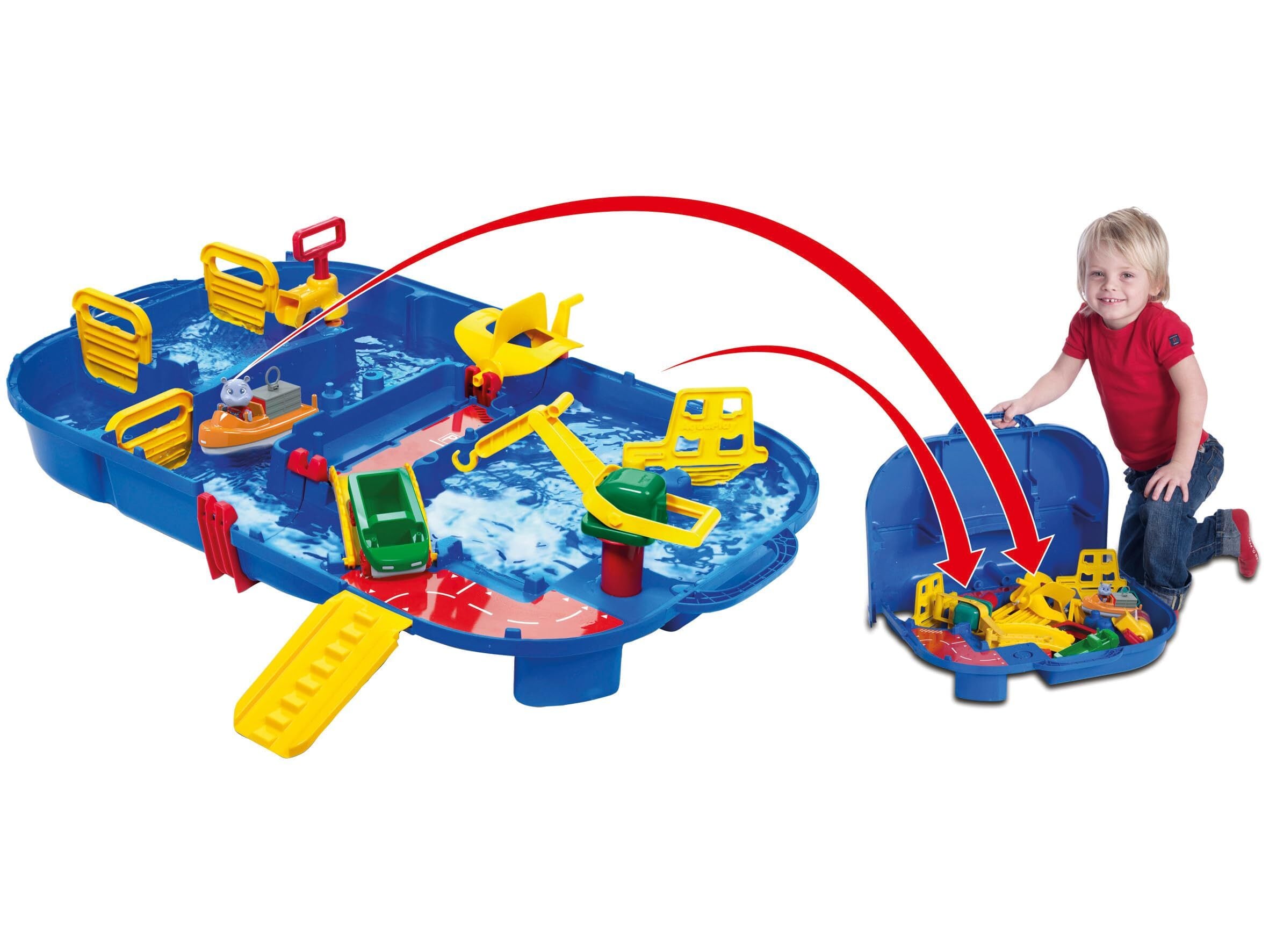 運河の国・スウェーデン生まれの「アクアプレイ」は、生活に「水」が密接に関わっている北欧ならではのあそび道具。物が水に浮かぶ、水の流れをつくる、水の力で物を動かすなど、遊びながら水のいろいろな性質を教えてくれます。また、年齢の違う子ども達と一緒に遊べ、役割意識やみんなで協力する力も育まれます。ロックボックスは付属品をすべて水路の中にしまうことができ、折りたたむとバッグ型になります。軽々と持ち運ぶことができるので、手軽に公園に持って行ったり、車に積んでレジャー先で楽しむことができます。小さいながら機能も満載のアクアボックスで、運河の不思議を体感してください。