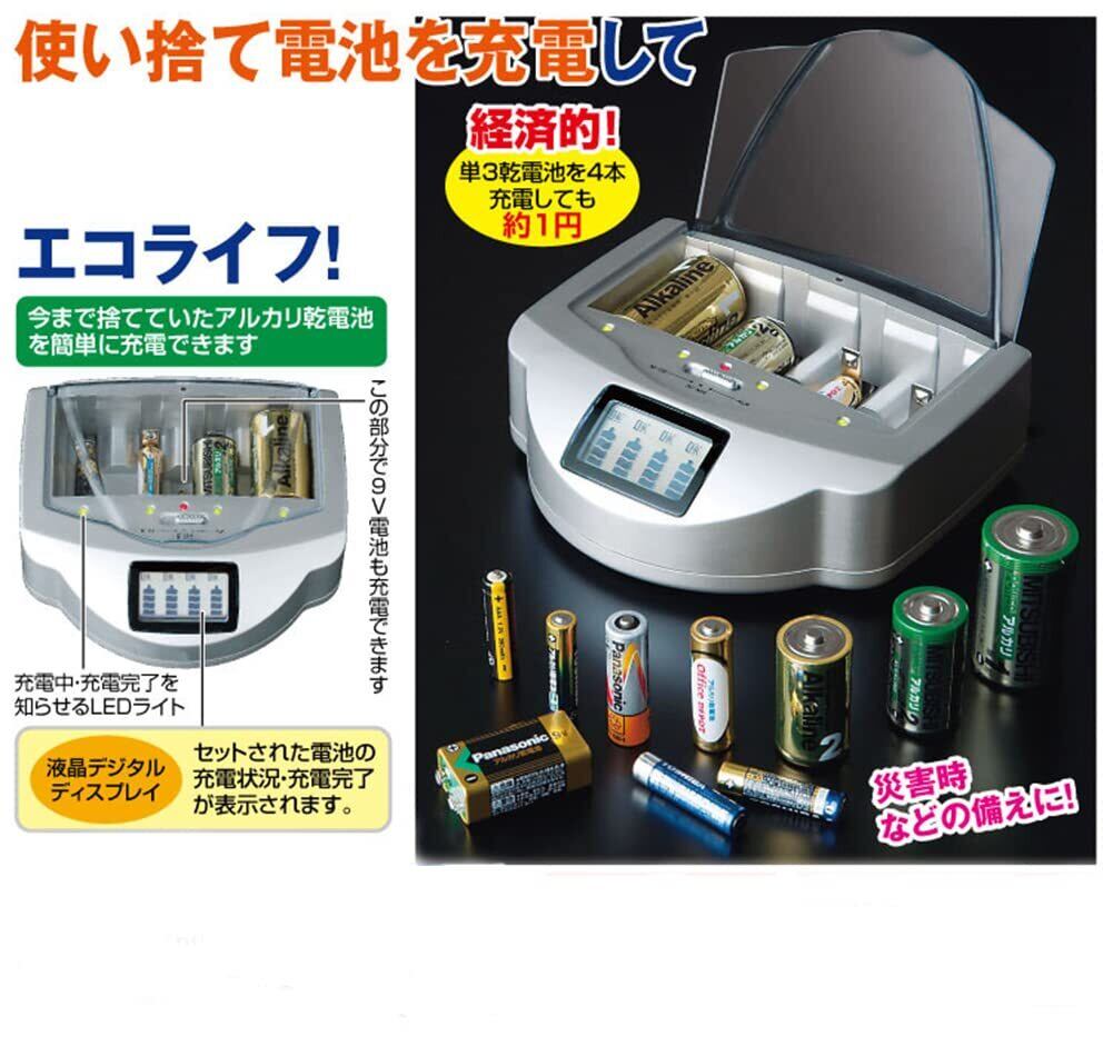 今までは空になったら捨てるのが当たり前だったアルカリ乾電池を、簡単に充電できる画期的な乾電池充電器のご紹介!使い捨てアルカリ乾電池をこまめに充電して約5~10倍長持ち