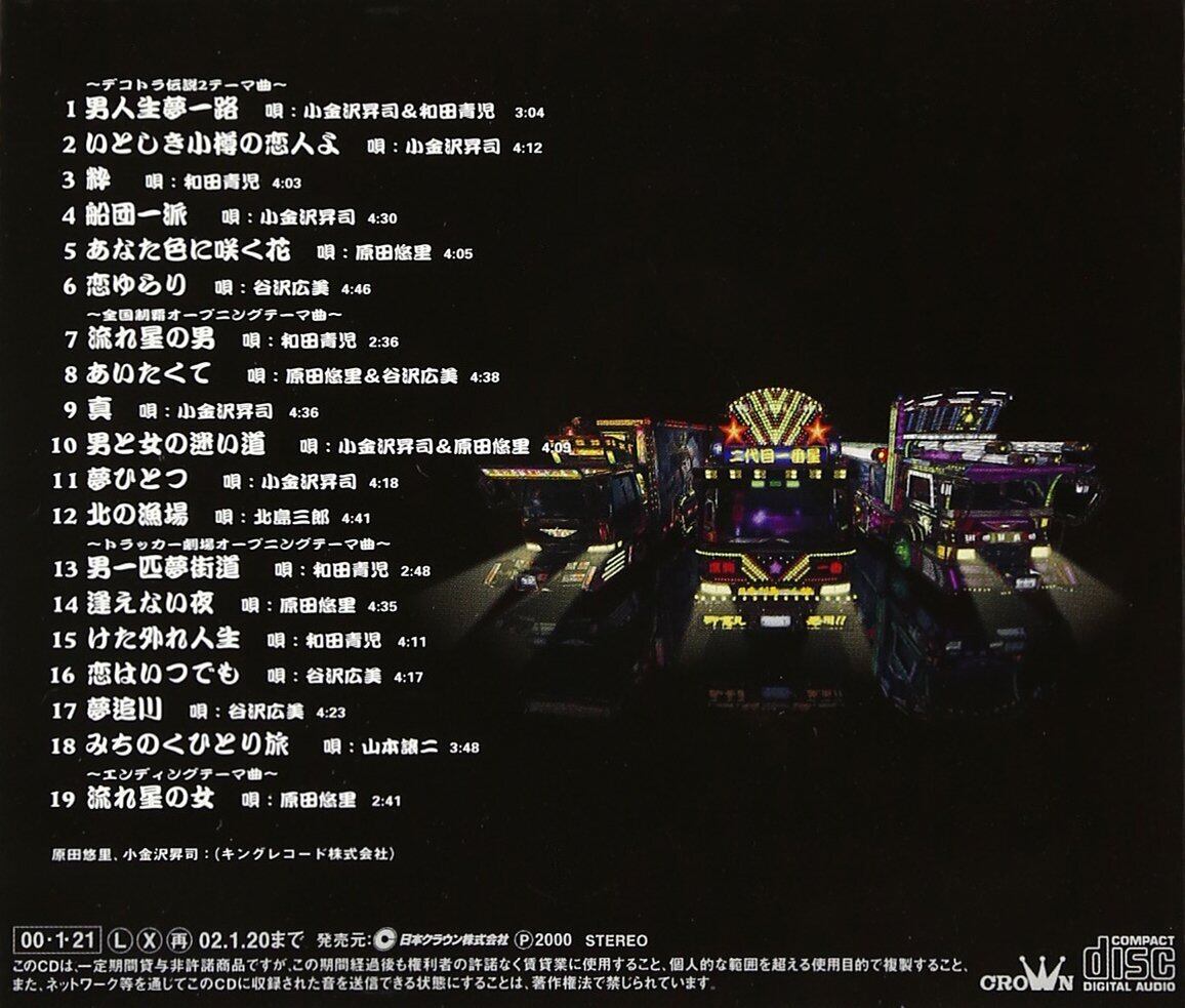 PS版『爆走デコトラ伝説 2~男人生夢一路~』のサントラ盤。山本譲二「みちのくひとり旅」、原田悠里「あなた色に咲く花」他、全19曲収録。 (C)RS