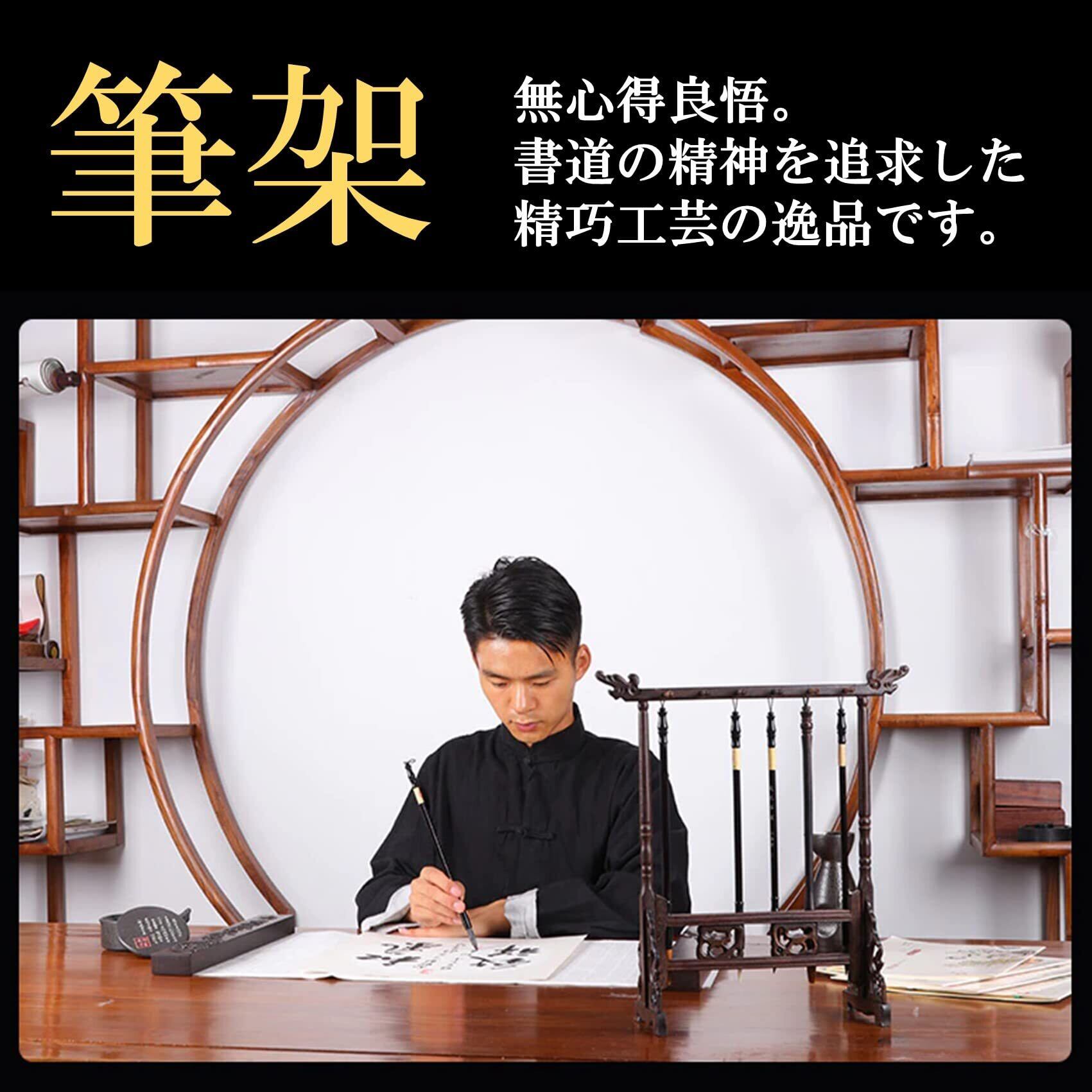 書道筆を掛けて保管するための筆かけです。片面6本両面12本の筆を掛けることができます。細部にまで美しく精巧な彫刻が施された工芸品です。素材は家具や建材にも使用されるウエンジ材を使用しており丈夫で耐久性に優れ長期間ご愛用いただける筆かけです。書家の精神を追求した伝統技巧の筆架です。