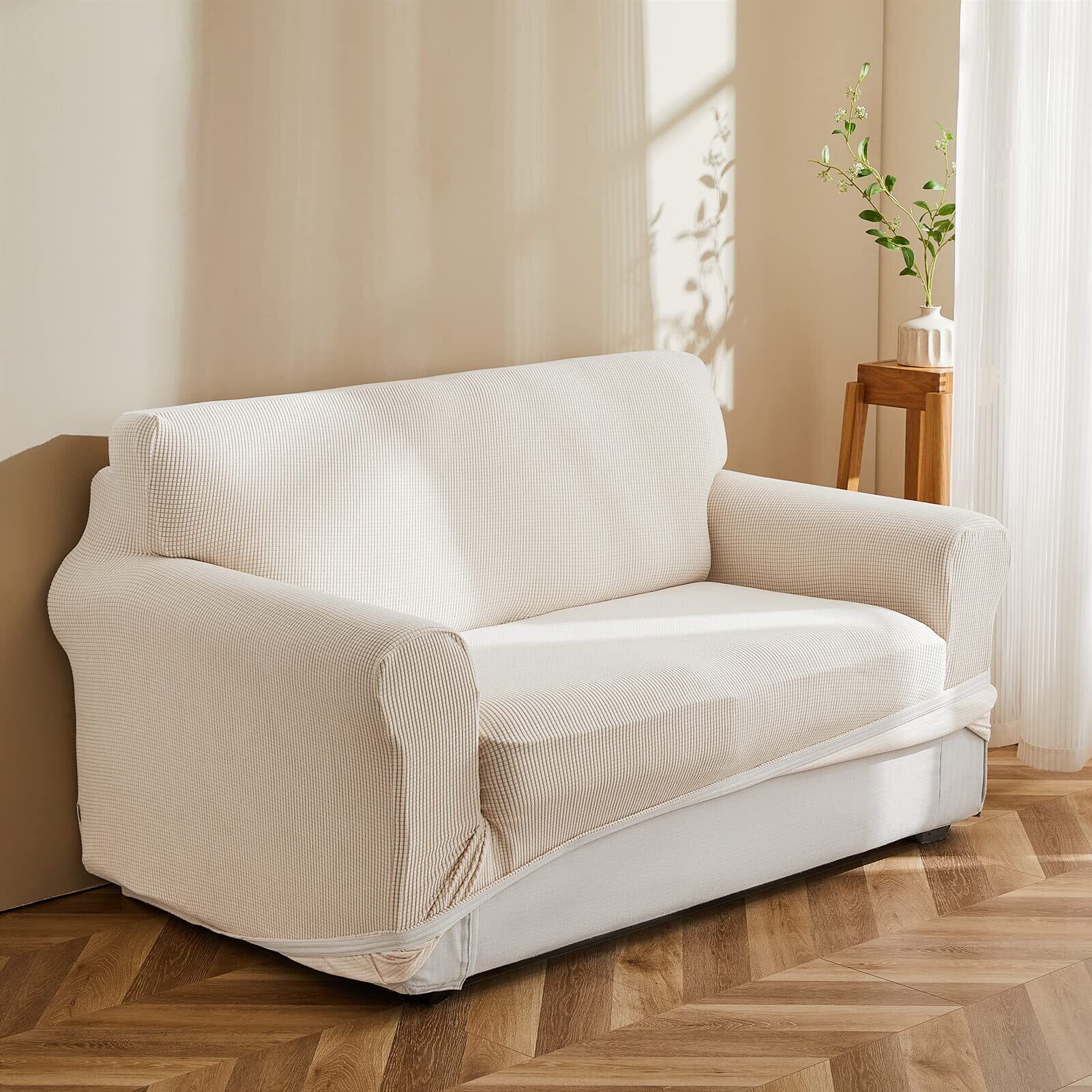 Topfinel ソファーカバー 3人掛け 肘付き 無地 北欧風 ストレッチ フィットタイプ 伸縮素材伸び良く 滑り止め 柔らかい 犬 猫 傷 防止 超便利 四季適用(ベージュ)
