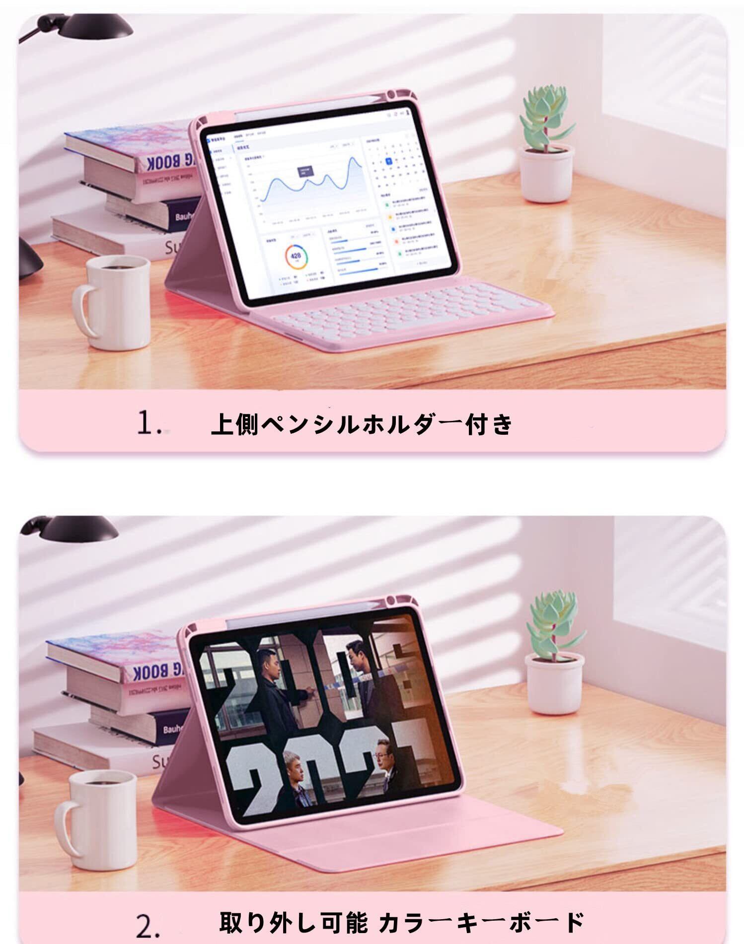 iPad 10.2 キーボードケース 縦 第9世代 第8世代 第7世代 アイパッド ペン収納 カバー iPad9/iPad8/iPad7/Air3/Pro10.5 耐衝撃 透明 クリア 背面カバー マグネット分離式 丸型キー ワイヤレスBluetoothキーボード 付き 可愛い, ピンク