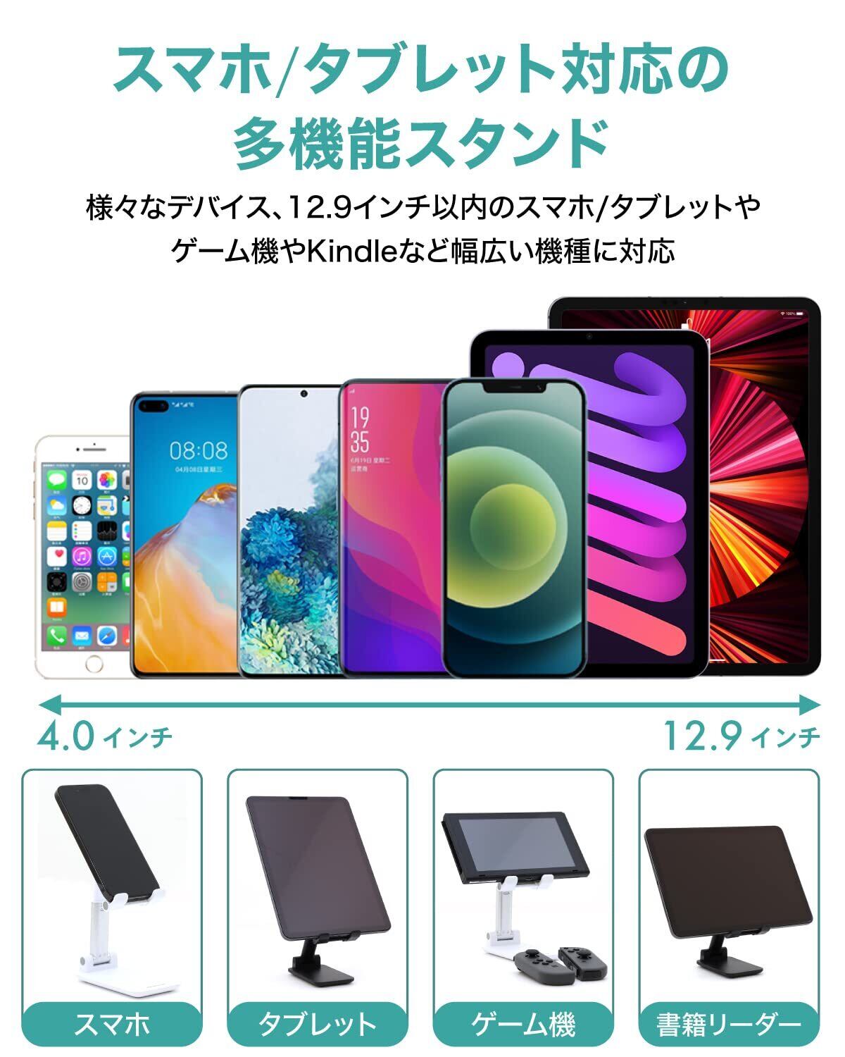 【幅広い対応機種】4~12.9インチの機種に対応可能。スマートフォンはもちろんのこと、12.9インチ以内のタブレットやゲーム機、Kindleなどの様々な機種に対応しています。