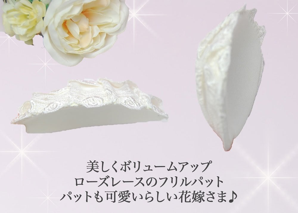 このパットを使えば自然にカップの浮きが無くなります。 ブラのレースとお揃いのバラレースを使用した美しいデザインのパットです。 入場の際など、お辞儀をしてもフリルパットだから、もし見えてしまっても大丈夫です。 胸元を気にせずに安心して過ごせます。 オリジナル商品
