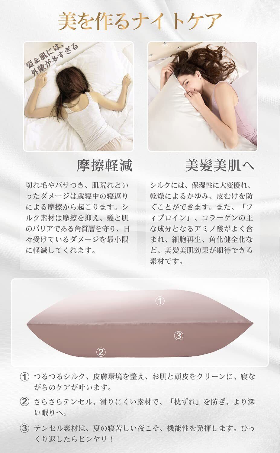 【天然繊維へのこだわり】古くから愛用されていたシルク素材、格調高雅な風合いと光沢が人々を魅了します。その中でもっとも希少な6Aクラス生糸を厳選しております。さらに、厚手の22匁生地を使用し、滑らかな肌触りとドレープ感をお楽しみいただけます。また、独自のカレンダー加工により、さらなる密度とつややかさをプラスします。シルク繊維は皮膚に最も近い成分でできているため、お肌と髪を守る最高の素材です。裏面のテンセル(リヨセル)生地は天然木材から作られた素材です。シルクと同じく肌に優しく上品な風合いで人気を博しています。肌に刺激を与えることがほとんどなく、お肌が弱い方にも安心してお使いいただけます。機能性が満点な二種類生地で絶妙なハーモニーがうまれ、触れるたび心も身体も癒してくれます。