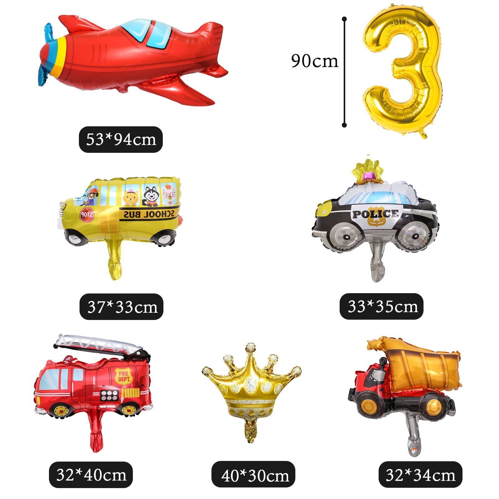 【セット内容】① 90cm 数字 3 バルーン ② 5個のホイルバルーン(トラック×1、飛行機×1、スクールバス×1、パトカー×1、消防車×1、王冠×1) ③ 紙吹雪風船×4 ④ ゴム風船×24(黄、青、赤) ⑤ 1セットお誕生日おめでとうバナー ⑥ 車ステッカー×2 ⑦ 小道具キット(リボンひも、両面テープ、バルーンチェーン) ⑧ 三角帽子×1