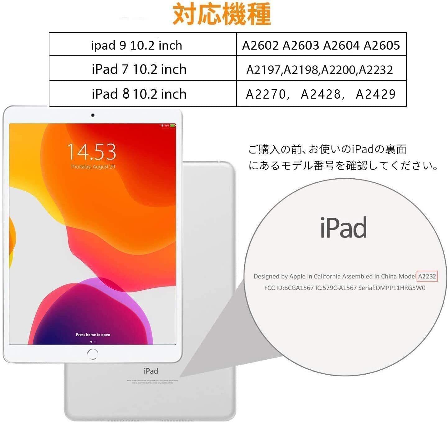 対応機種: 2021/2019/2020秋発売の最新版 iPad 10.2 第7/8/9世代 適用のiPad型番:(モデル番号A2602 A2603 A2604 A2605 A2430/A2197 / A2198 / A2200/A2270/A2428/A2429)に対応する専用保護ケース、他のiPadモデルと互換性がありません、ご注文の際に、お手元機種の背面にあるモデル番号を対照し、確認をお願い致します