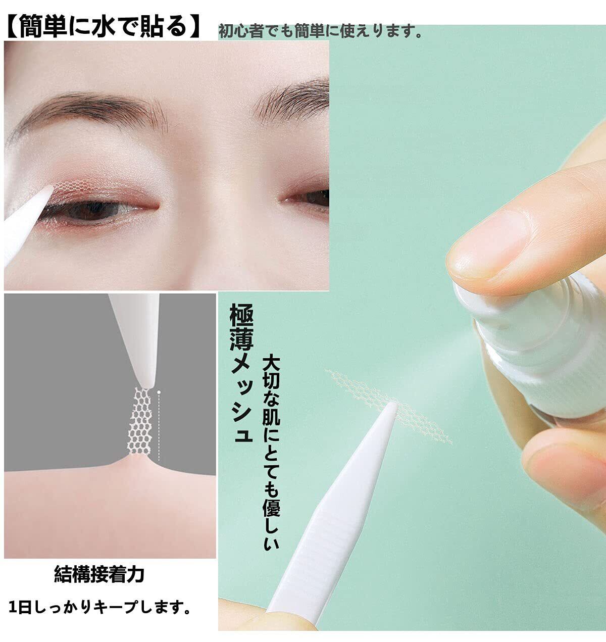 【簡単に水で貼るの方法】1.化粧水で目の周りの肌をキレイにします。2.テープを取り、水を均等に吹きかけます。3.ピンセットでテープを適当な位置にくっつけます。4.目を少し閉じて、接着剤が乾くまでY型フォークで調整します。【除去方法】メッシュアイテープを除去する時は「クレンジング」方法で除去してください。直接に引き裂くことはできません。