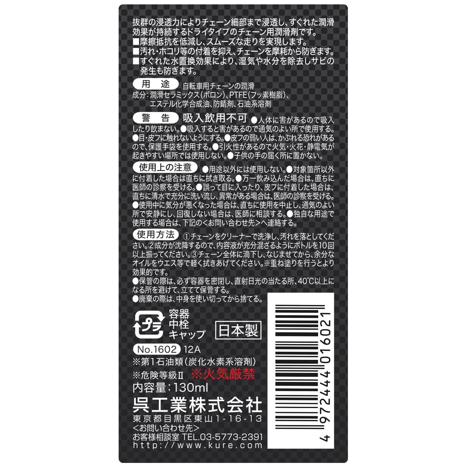 KURE(呉工業) Made For Speed チェーンルブ ドライ 130ml 自転車用チェーン潤滑剤 1602