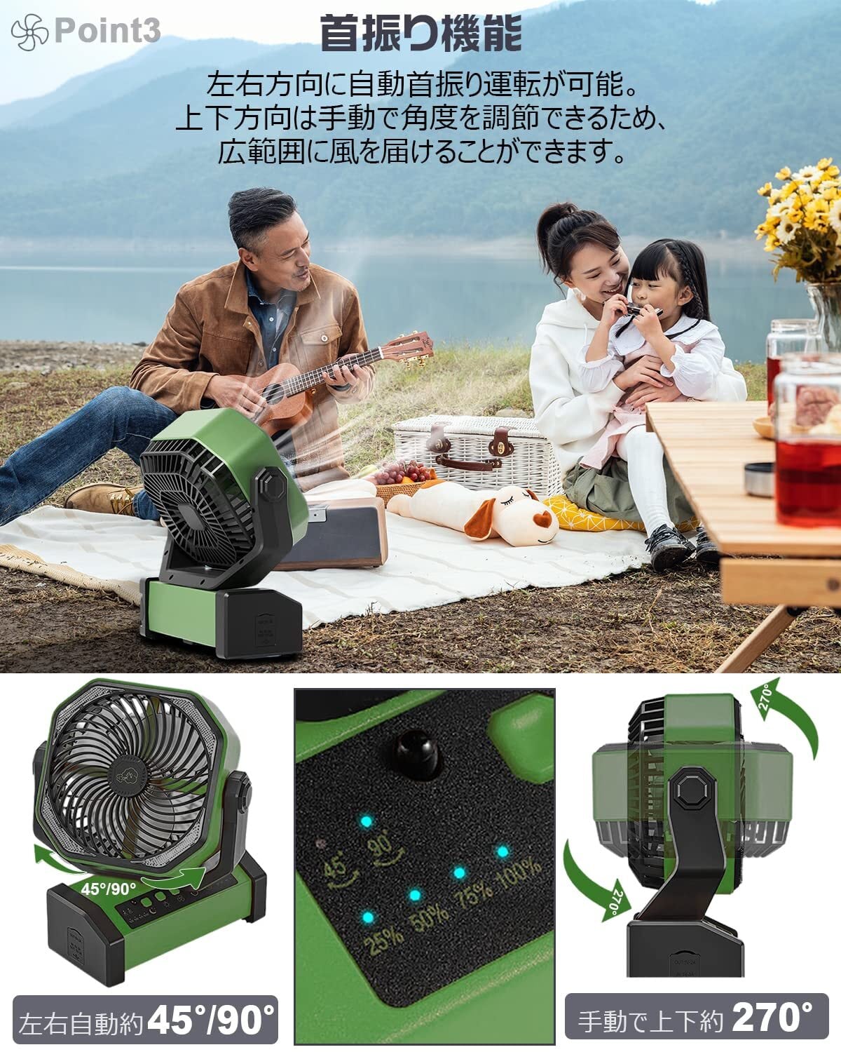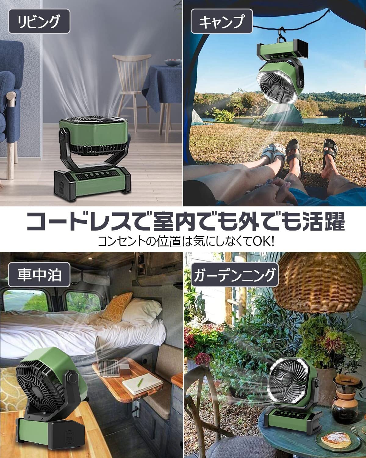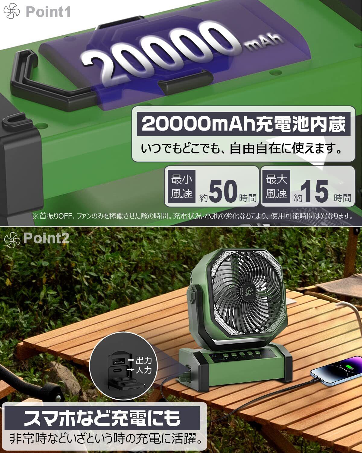 【自動首振り&20000mAh】 扇風機 キャンプ アウトドア 充電式ファン 充電式扇風機 コードレス リモコン付き 切タイマー ポータブル 小型 屋外 サーキュレーター 二重反転ファン 風力4段階 LEDライト 吊り下げ 強力送風 暑さ対策 アウトドア用 災害対策 グリーン