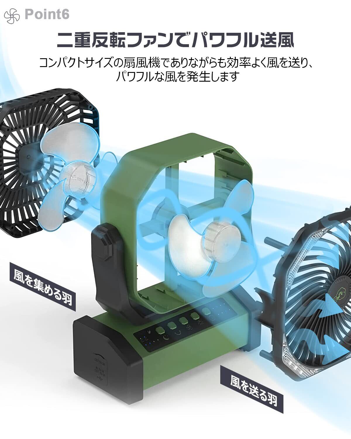 ❉【超大容量20000mAh&二重反転ファン】コンセントが届かない場所でも使える、充電式ポータブル扇風機です。超大容量20000mAhのリチウムイオンポリマー電池を内蔵しています。フル充電の場合、最小モードで約50時間の連続使用ができます。最大モードでも約14時間の連続使用が可能です。また、二重反転ファンにより、コンパクトサイズでありながらも効率よく風を送り、パワフルな風を発生します。室内はもちろんキャンプや車中泊などの屋外でも活躍します。