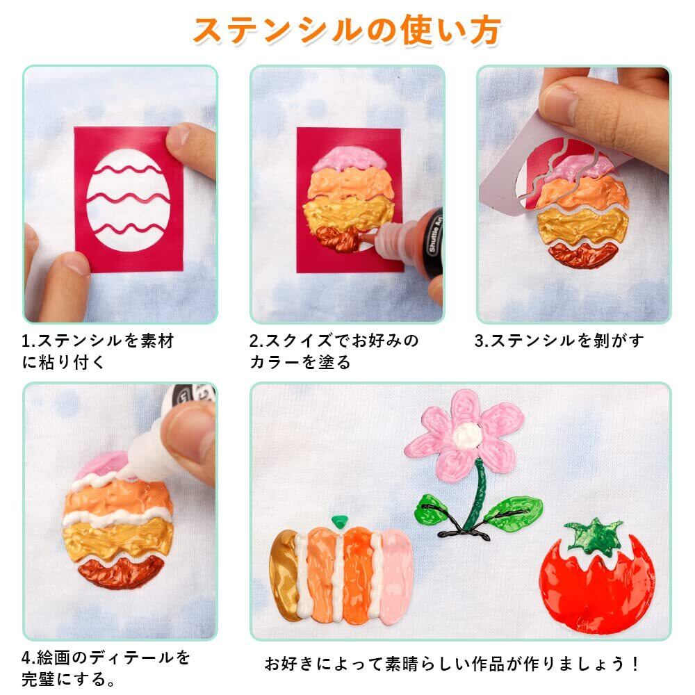 【安全無毒のおもちゃ】安全な材料で作られて、無毒、無酸で子供の肌に無害で、環境にやさしいし、いやなにおいはしません。USA品質安全規格ASTM D- 4236とEN71基準も適合しています。また、スクイズでストレスなく自由に面白いパターンやデザインを制作することが可能で、柄を付けやすいように、ステンシルシートを使ってお子様でも上手く仕上がります。ご使用後は、キャップをしっかりしめて縦置きに保管してください。