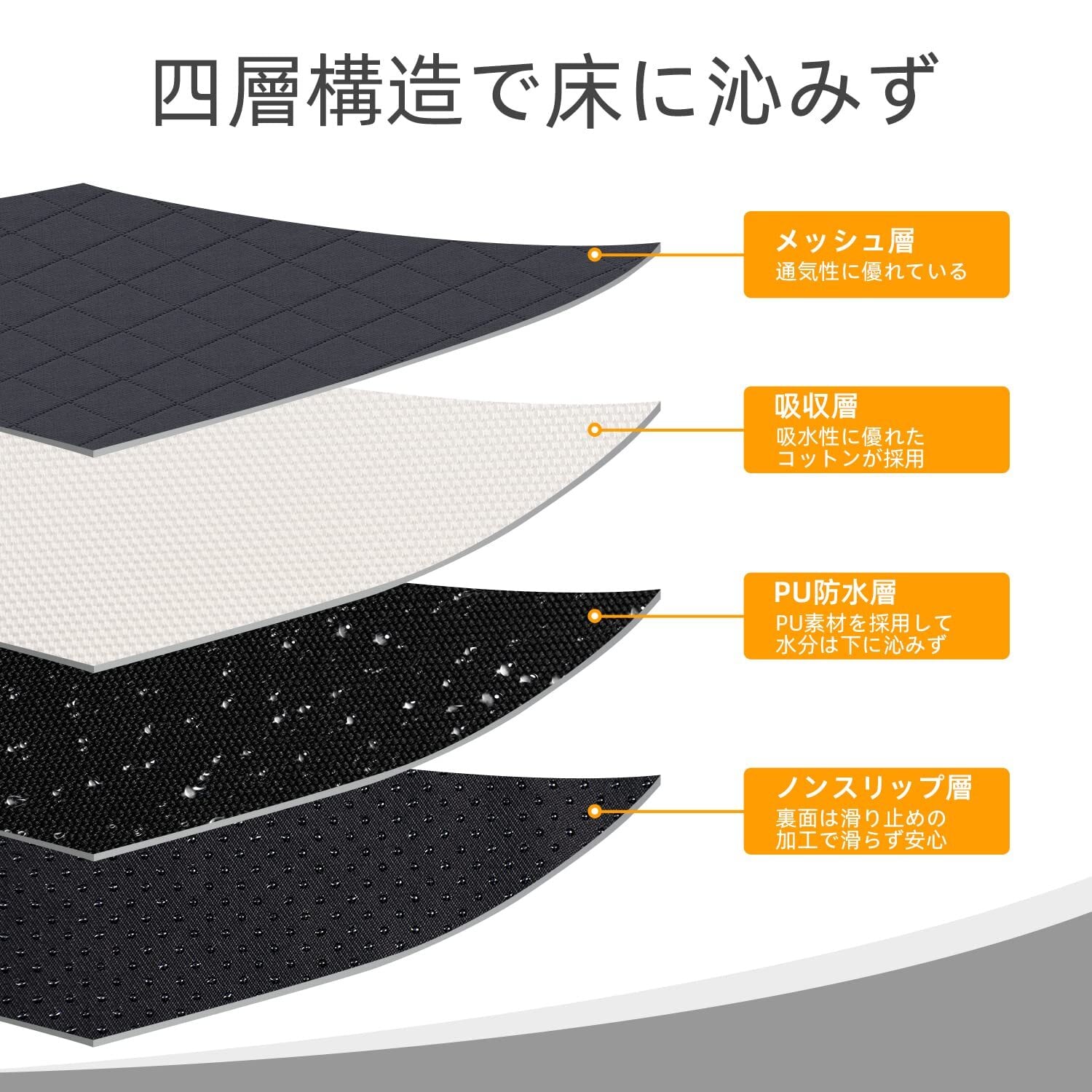 【お掃除が楽に】4層構造のデザイン、表面はメッシュ層で通気性が良く居心地が良い、2層目は吸水性に優れたコットン生地を採用し、おしっこは素早く吸収される。3層目はPU素材を使用し水が通りにくく、床に沁みず。裏面は滑り止め粒子がついており滑りにくい。部屋のお掃除も楽になります。