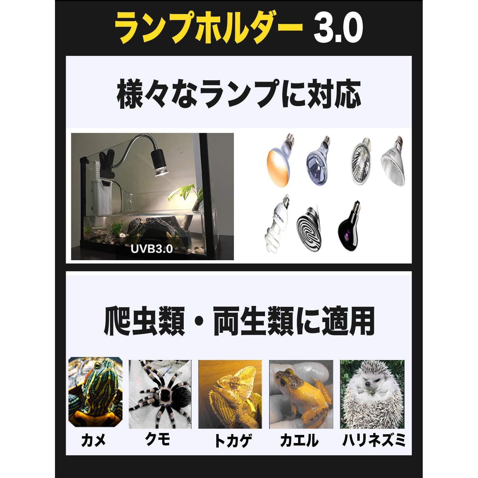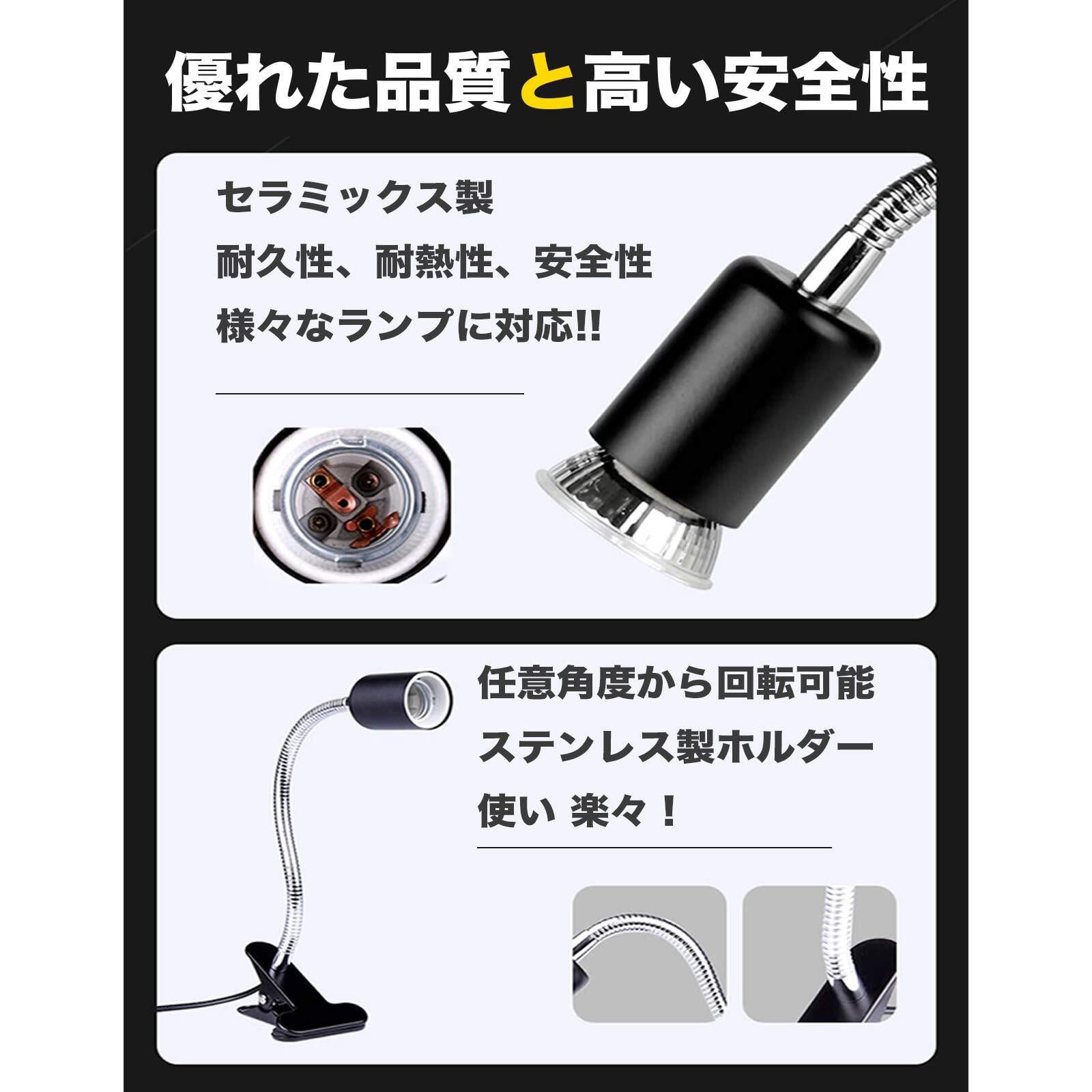 『高品質なライトスタンド』ランプホルダーはセラミックス製、耐久性、耐熱性はもちろん、ケーブルにある回転ボタンで光を調節し、最適な光を照射することができます。ステンレス製の本体で360度回転可能に設計され、光をちゃんとペットにお届きします。末端はゴムが付いているクッリプで、飼育ケースに挟んだり、壁にかけたりして、好きな角度、使い心地のいいところから日光浴させましょう。