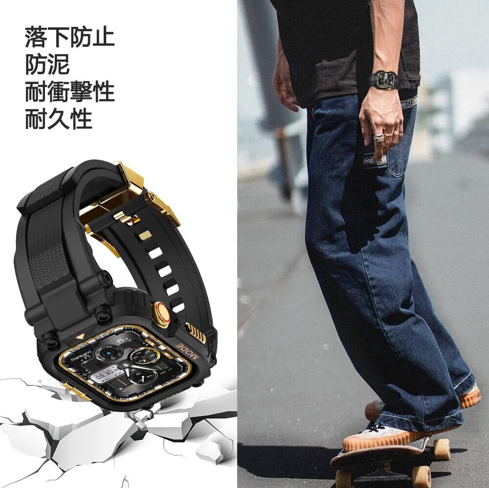 コンパチブル For Apple Watch バンド 45mm 44mm 42mm バンパーケース付き 頑丈なメンズTPUベルド 一体型 スポーツバンド for アップルウォッチ バンド用 iWatch Series 9/8/7/SE/6/5/4/3/2/1に対応 42 44 45 mm 耐衝撃 装着簡単 ブラックゴールド