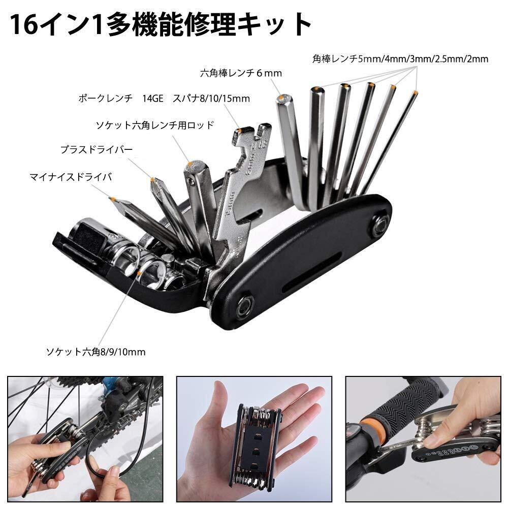パッケージ内容: ●収納バッグ×1 ●16-in-1マルチツール×1 (マイナスドライバー、プラスドライバー、ボックスレンチ、スパナ8/10/15/mm、六角レンチ2/2.5/3/4/5/6mm、スポークレンチ) ●空気入れセット: ミニポンプ×1、自転車フレーム×1,ボルト×2、風船/浮き輪用アダプター×2、ボール用アダプター×1、ポンプ専用のホース×1