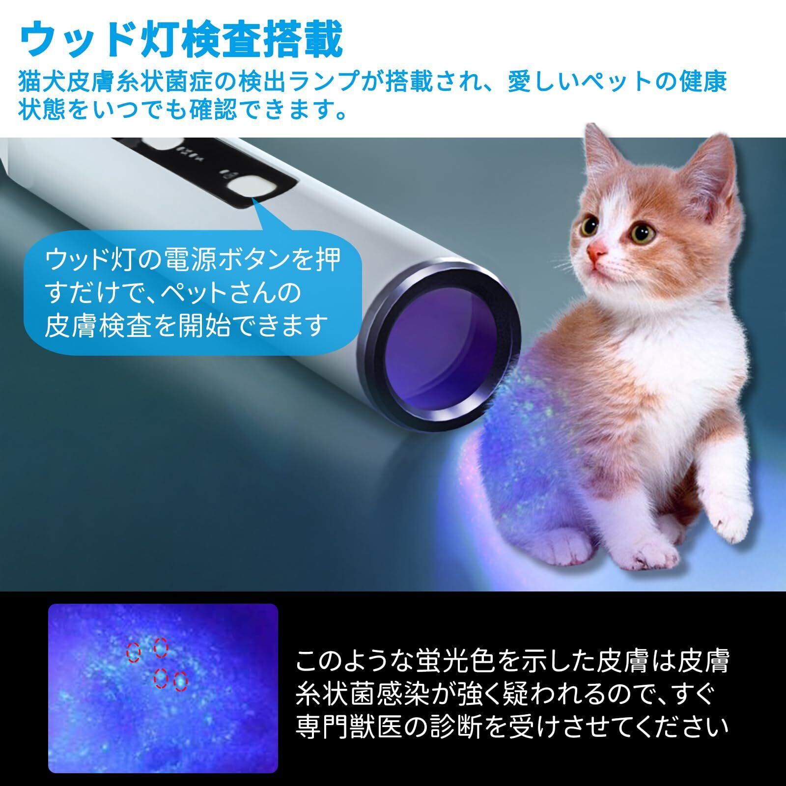 【ウッド灯付き&皮膚自宅検査】弊社の最新改良版ペット用バリカンは、尾端にウッド灯が付属しており、犬や猫ちゃんなどの皮膚を自宅で検査できます。暗い環境で、皮膚から5-10cmぐらい距離で照射したら、蛍光色を示したところは皮膚糸状菌感染が強く疑われます。その場合は、直ちに専門獣医の診断を受けてください。