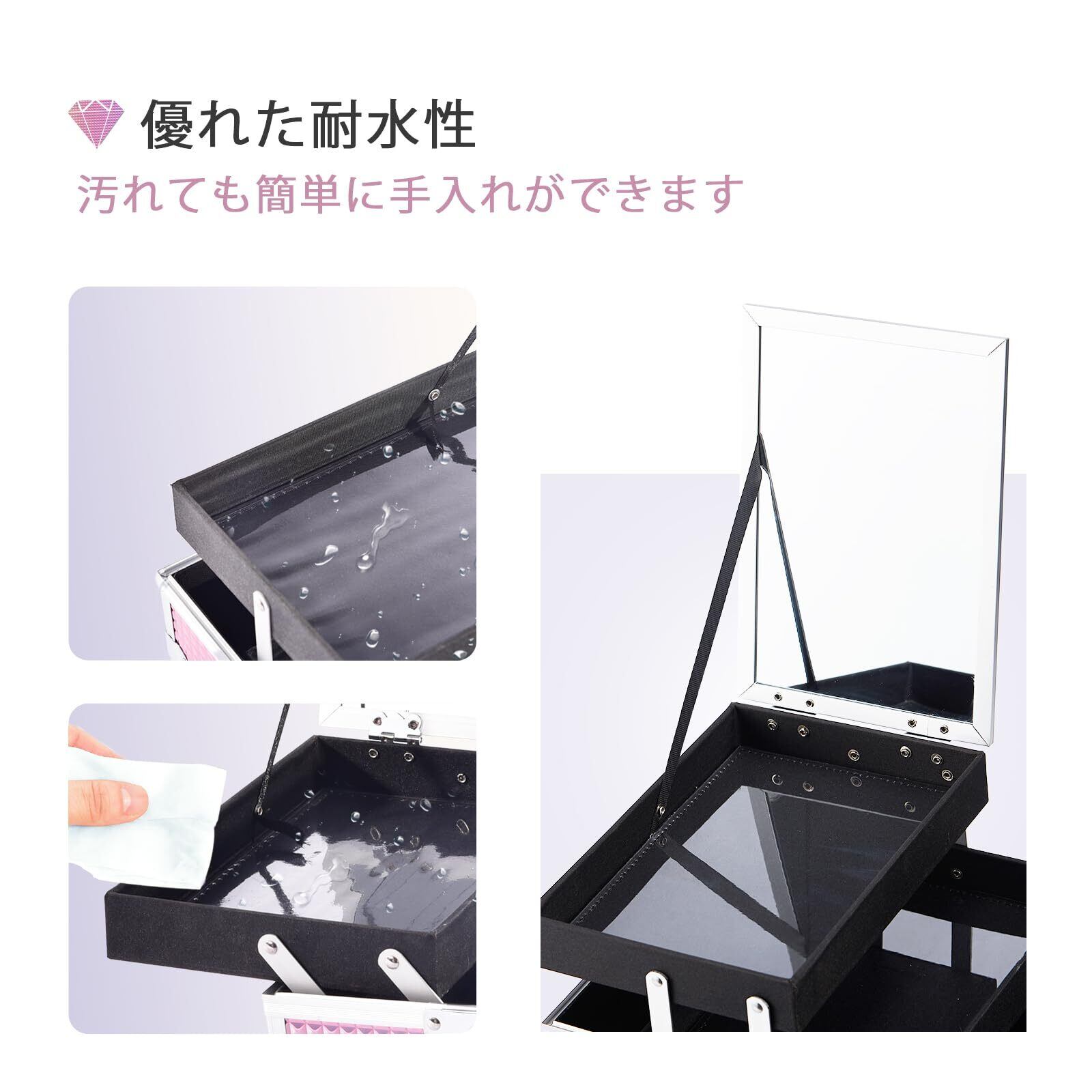 【素敵な内部構造】化粧箱の伸縮式収納トレイは、広がって自由に調整可能。トレイ内部に透明なブラスチックを張り、汚れてもきれいに清掃しやすい。化粧ミラーもついているので、場所問わずメイクができます。美容師・ヘアメイク・コスプレにも快適!
