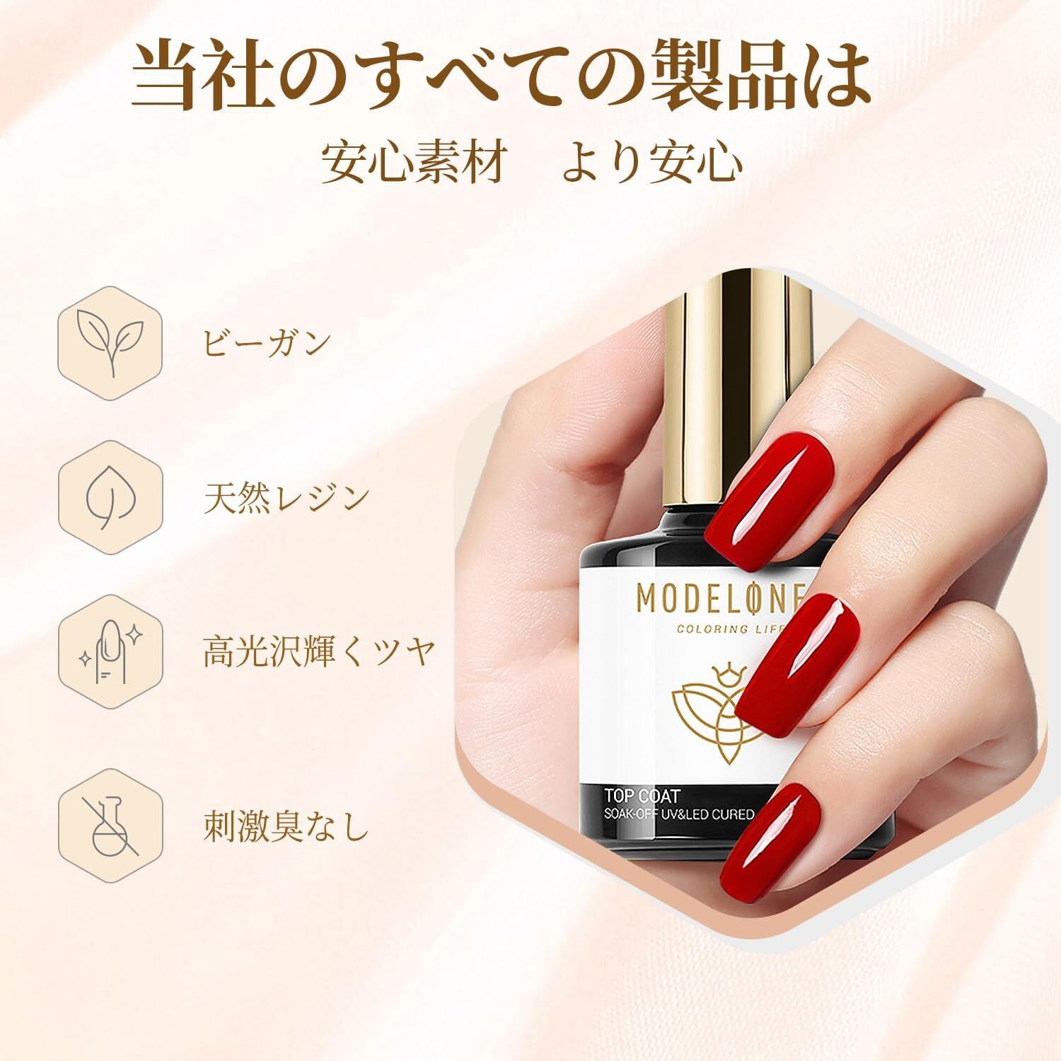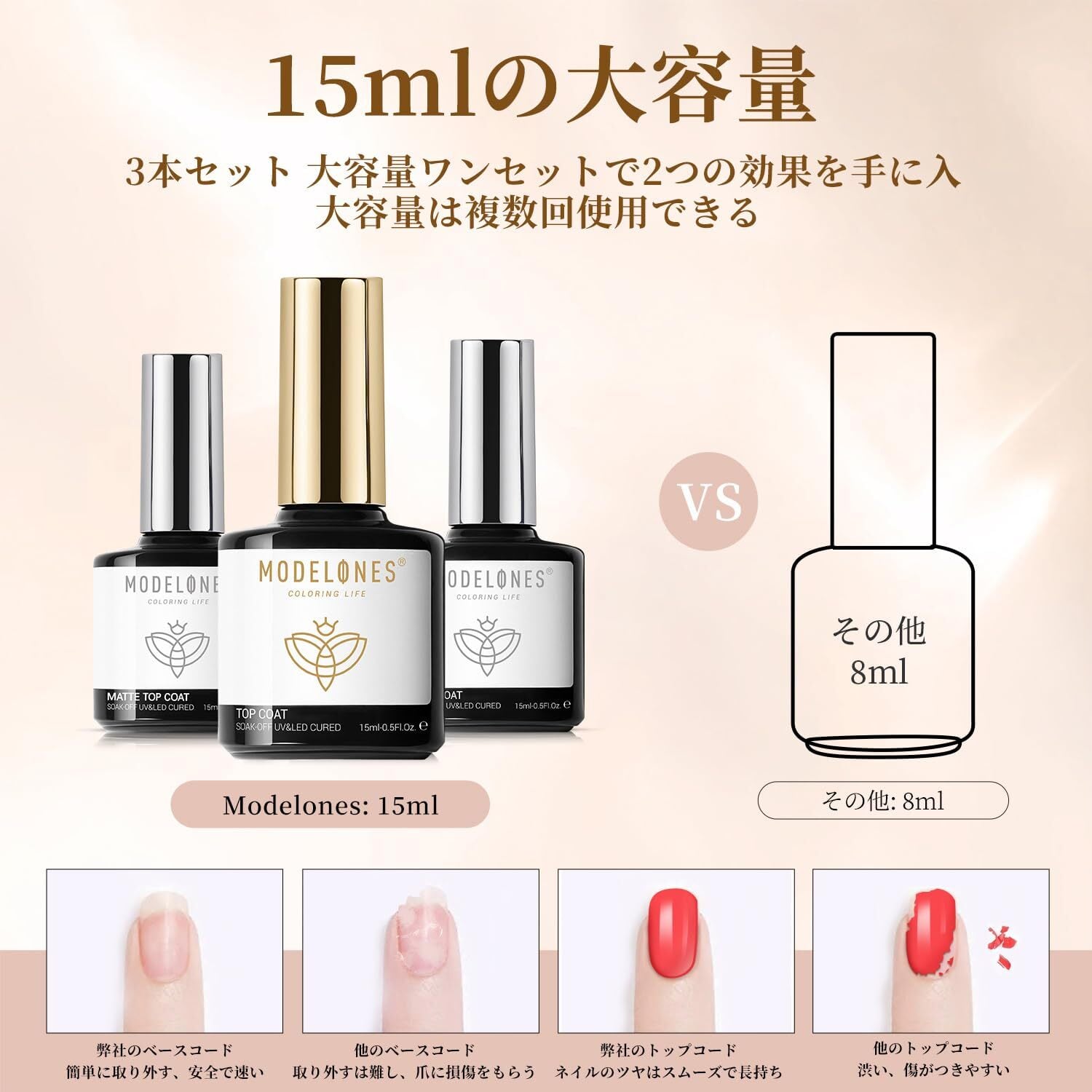 処方をアップグレード:Modelonesのトップとベースコートは、アップグレードされた処方で作られています。傷、欠け、汚れなどを防ぐことができて、ネイルは鏡のようなツヤが長続きします