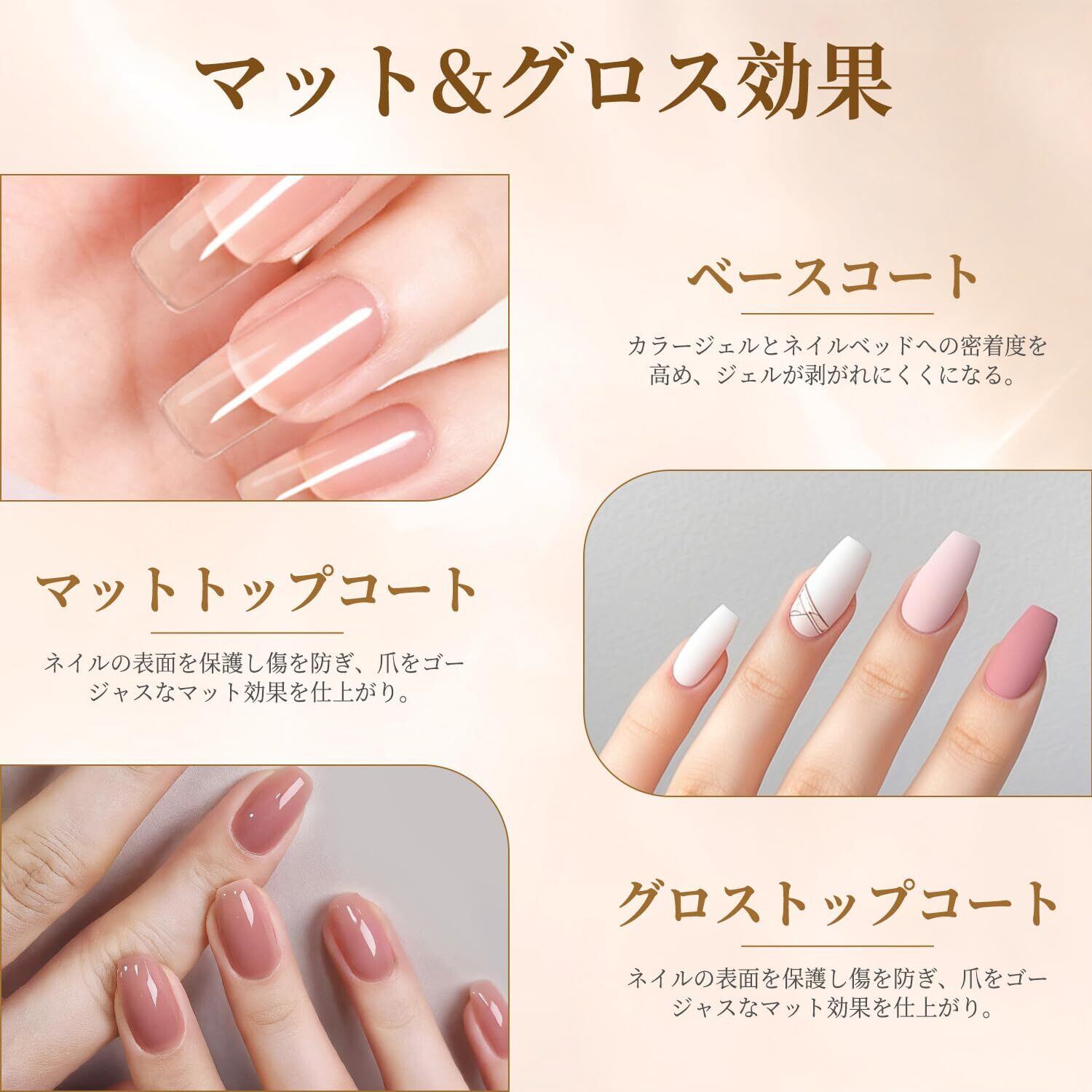 ベースコートの機能:ネイルとカラージェルの接着性を高め、より良いネイルパフォーマンスをもたらします。ベースコートを薄く均一に塗って、ネイルを長持ちさせることができます