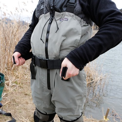 アングラーの腰をしっかりとやさしくサポート。左右のベルトを引いて腰にフィットさせます。