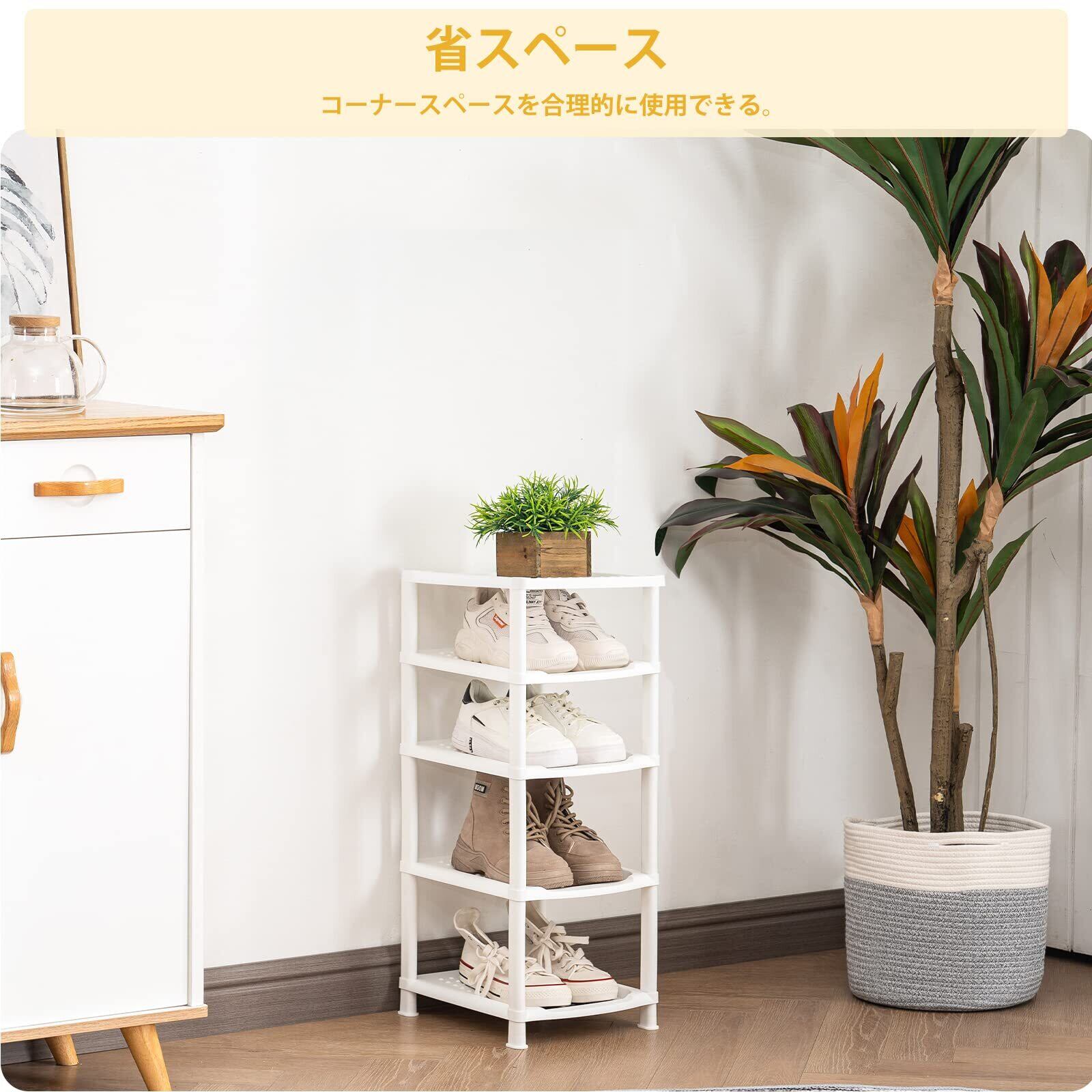 【スリム・省スペース】この縦長なシューズラックは専門に狭い場所に対応したの設計です。「サイズ:33x26x66cm」玄関、寝室、バスルーム、デパートの僅かな隙間などの場所に置くことができ、部屋をすっきり見せます。5段ラックには大人靴5足、各段に1足靴置きことができ、靴収納の需要を満たすと同時によりスペースを節約できます。一人暮らしでも家族でも、あなたに最適な選択です。