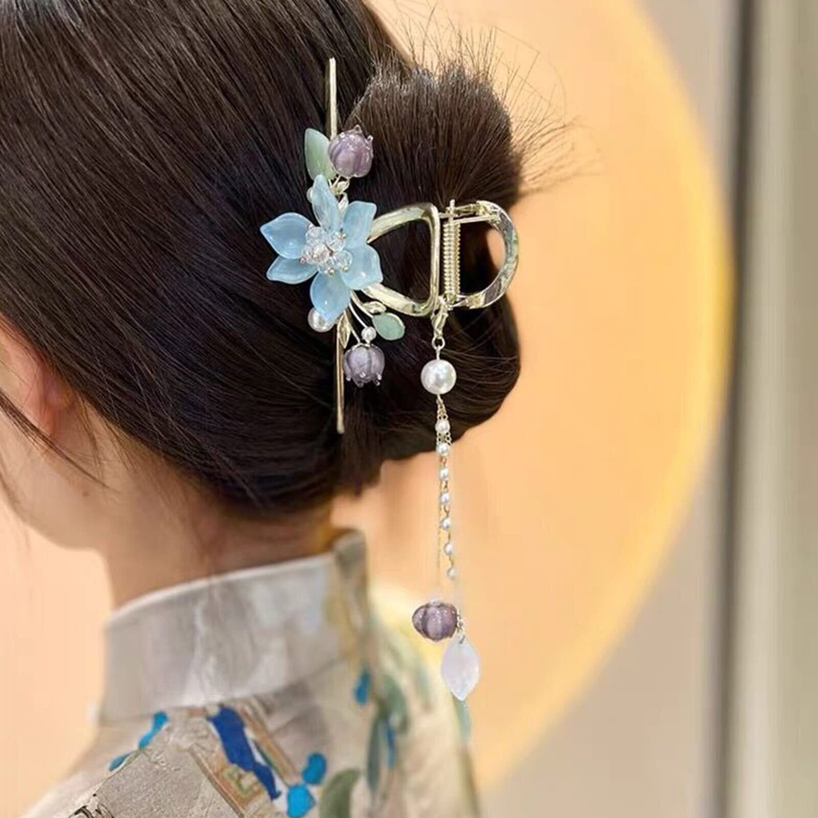 バンスクリップは耐久性のある軽合金/高品質のアクリル素材と模造真珠でできており、長時間美しい光沢を保ち、下がり飾りが歩くたびに揺れ、髪のオシャレをさりげなく彩ります