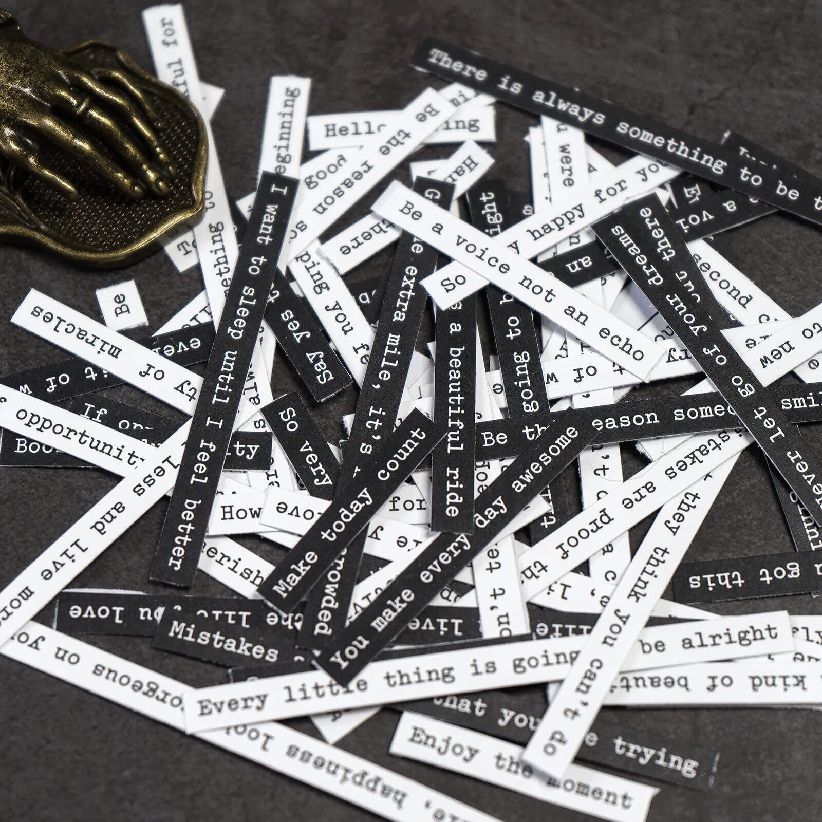 【ジャンクジャーナル-ヴィンテージステッカー】これらのフレーズステッカーは、昔ながらのタイプライターフォントで特別に設計されています。 そして、ビンテージの外観を作成するために白黒の背景に印刷されます。 ジャンクジャーナル、スクラップブッキング、コラージュに最適です。