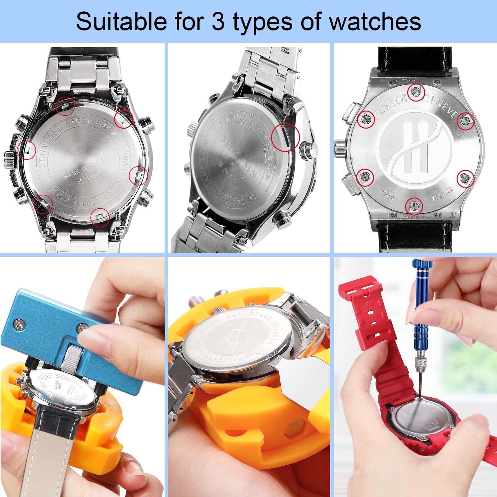 【時計カバーの違いに適しています】-時計バックケースオープナーは、溝のある時計ケースに使用されます、時計カバーのこじ開けナイフはこじ開け穴のある時計ケースに使用されます、ドライバーがスクリューメーターカバーを開きます、ピンセットはバッテリーを取り外すために使用されます。時計カバーオープナーの範囲は15〜60mmで、時計の溝に合わせて調整ホイールを回転させることでドリルビット間隔を設定できます。