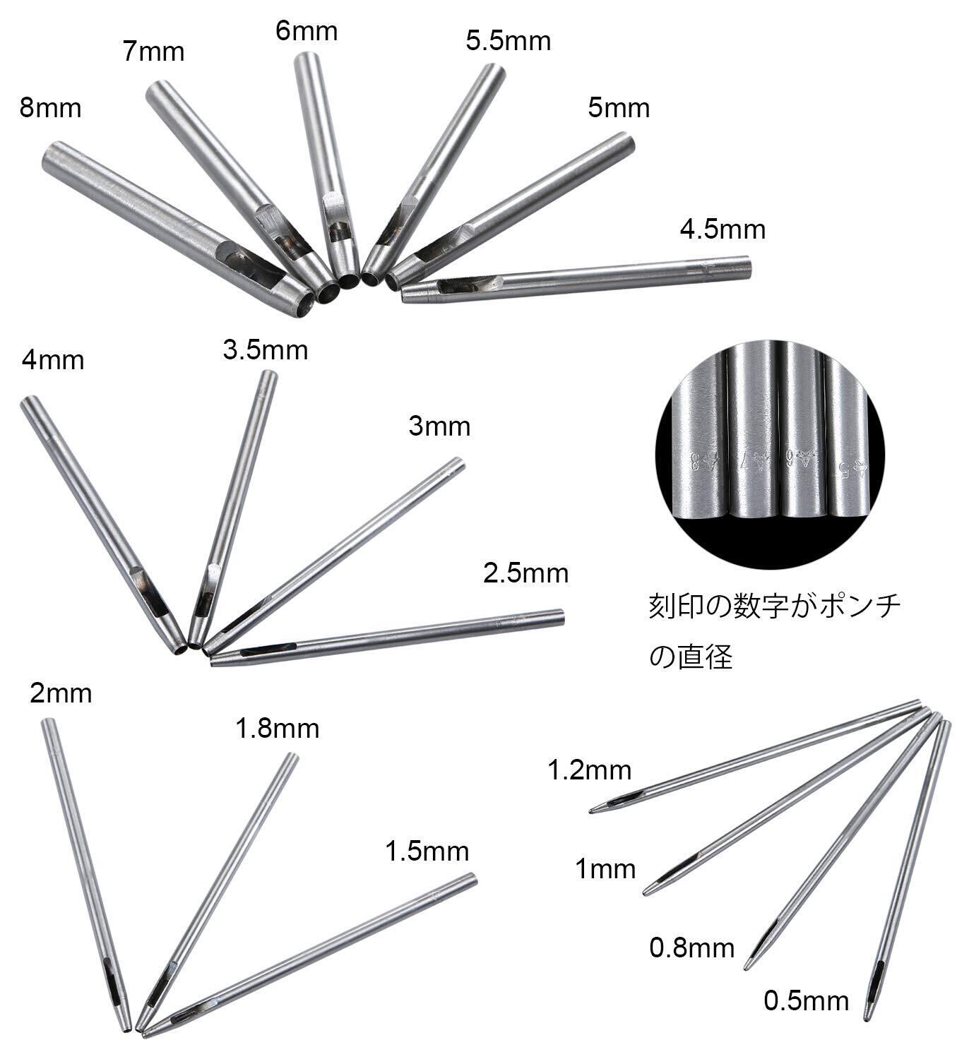 17サイズ 穴あけポンチ ハトメ抜き 丸形 円型 ポンチセット ポンチ ポンチ 中空 打ち具 パンチ ベルト 道具 DIY 0.5mm 0.8mm 1mm 1.2mm 1.5mm 1.8mm 2mm 2.5mm 3mm 3.5mm 4mm 4.5mm 5mm 5.5mm 6mm 7mm 8mm